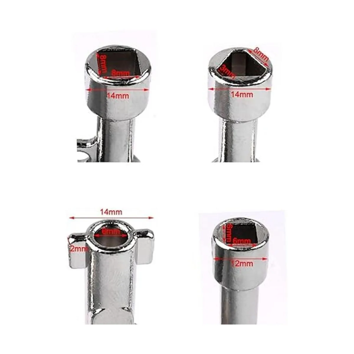 Multifuncional: llave cuadrada hembra de 15/64 pulgadas, llave cuadrada hembra de 5/16 pulgadas, llave cuadrada hembra de 3/8 pulgadas dimensión lateral y una llave de esqueleto de doble cara.