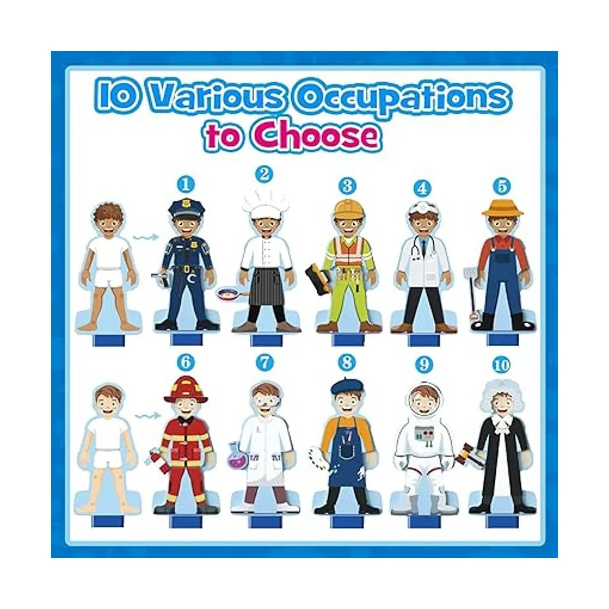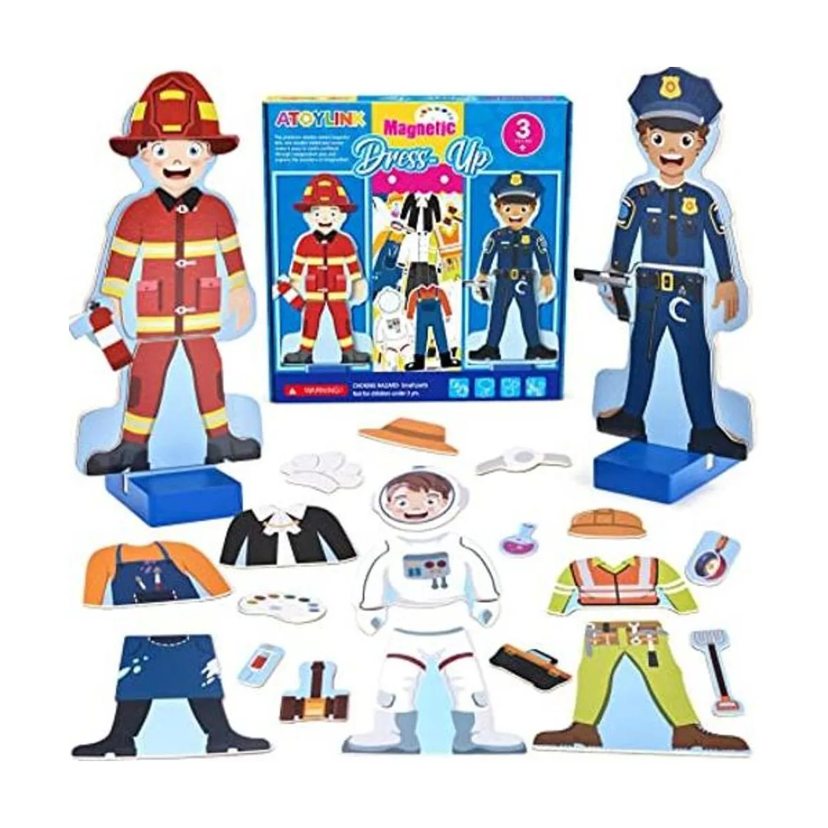 Juego de disfraces de disfraces: imprescindible para niños pequeños que aman jugar a vestirse. Viene con 2 soportes de madera diferentes para muñecas y un surtido de más de 40 piezas de atuendo magnético y accesorios en 10 ocupaciones diferentes, incluyendo policía, médico, bombero, juez, ingeniero, etc. Suficiente para que tus hijos fingan jugar con facilidad.