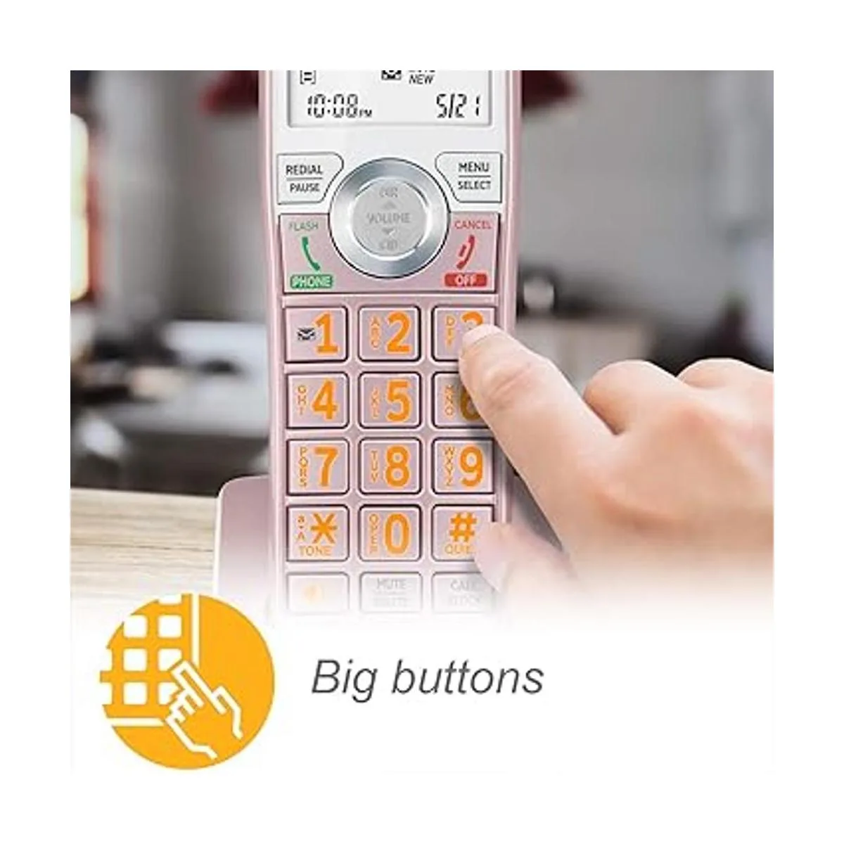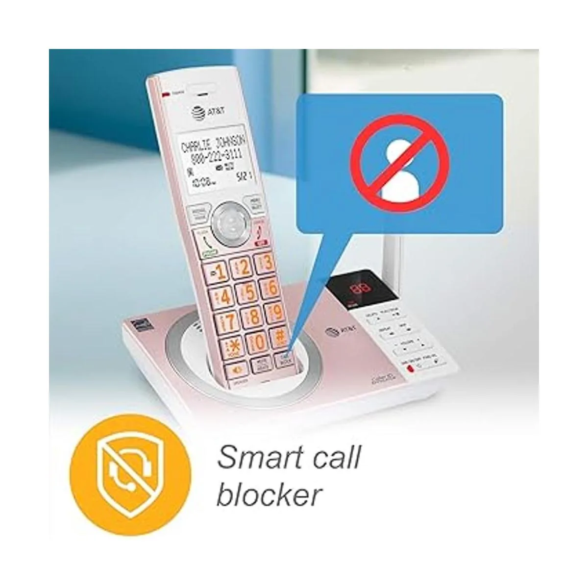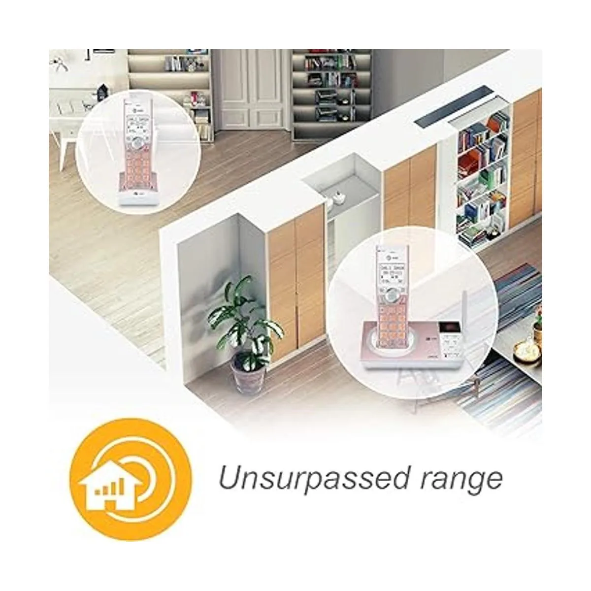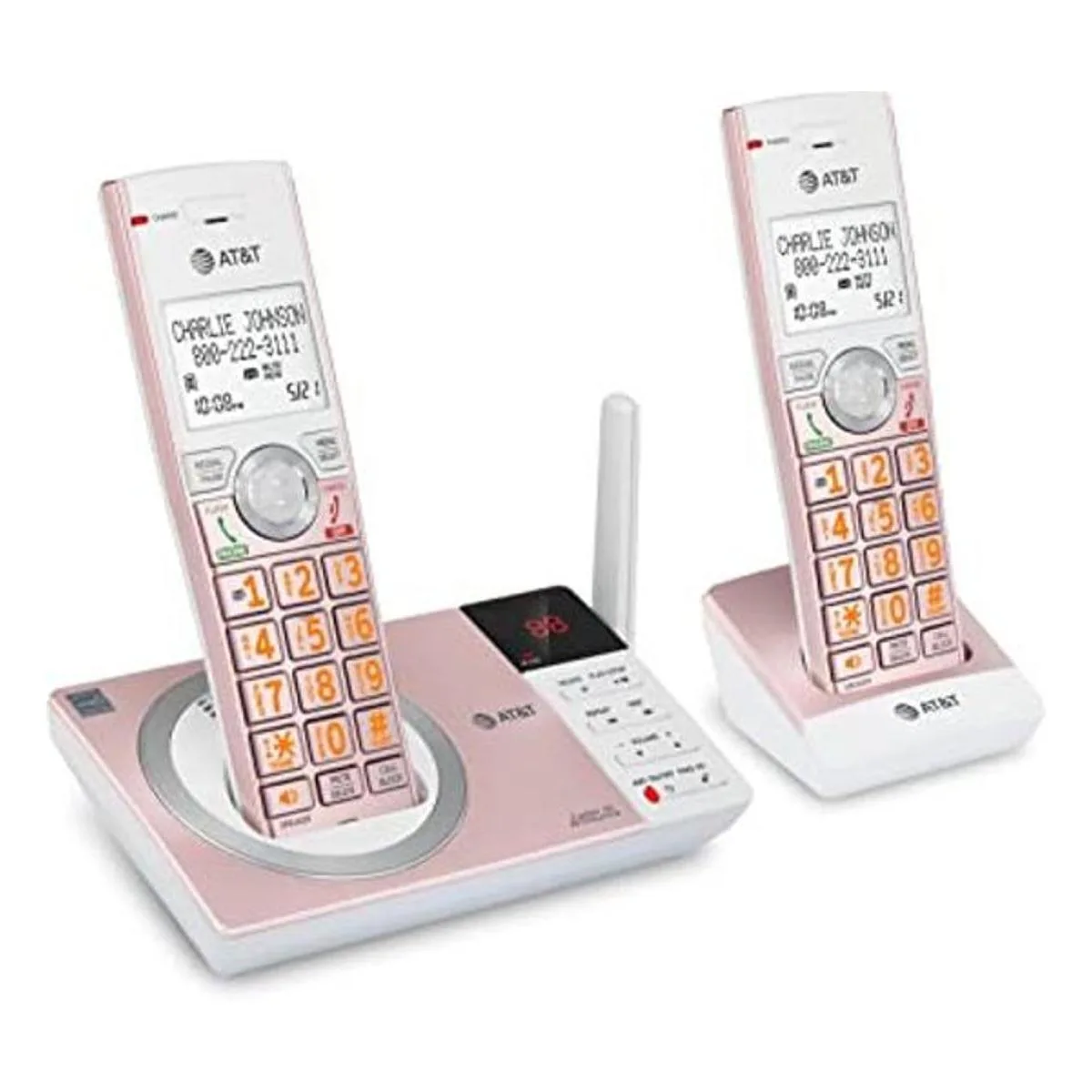 ATT CL82257 DECT 6.0 Teléfono inalámbrico de 2 auriculares para el hogar con contestadora, bloqueo de llamadas, identificador de llamadas por voz, intercomunicador y de largo alcance. Oro rosa