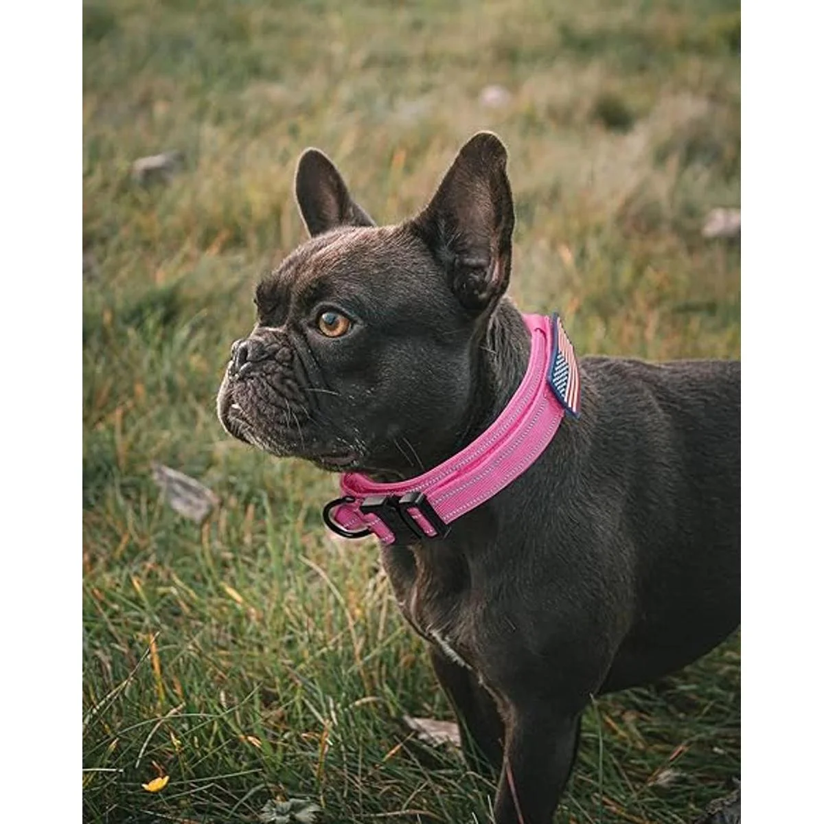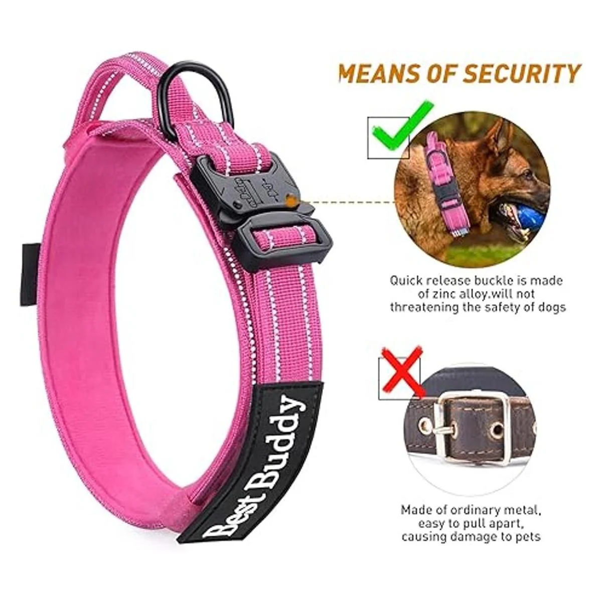 AUBELL Collar reflectante para perro, collar táctico ajustable de nailon militar K9 con asa y hebilla de metal resistente para perros medianos y grandes, con dos parches y soporte para funda para AirTag rosa, M