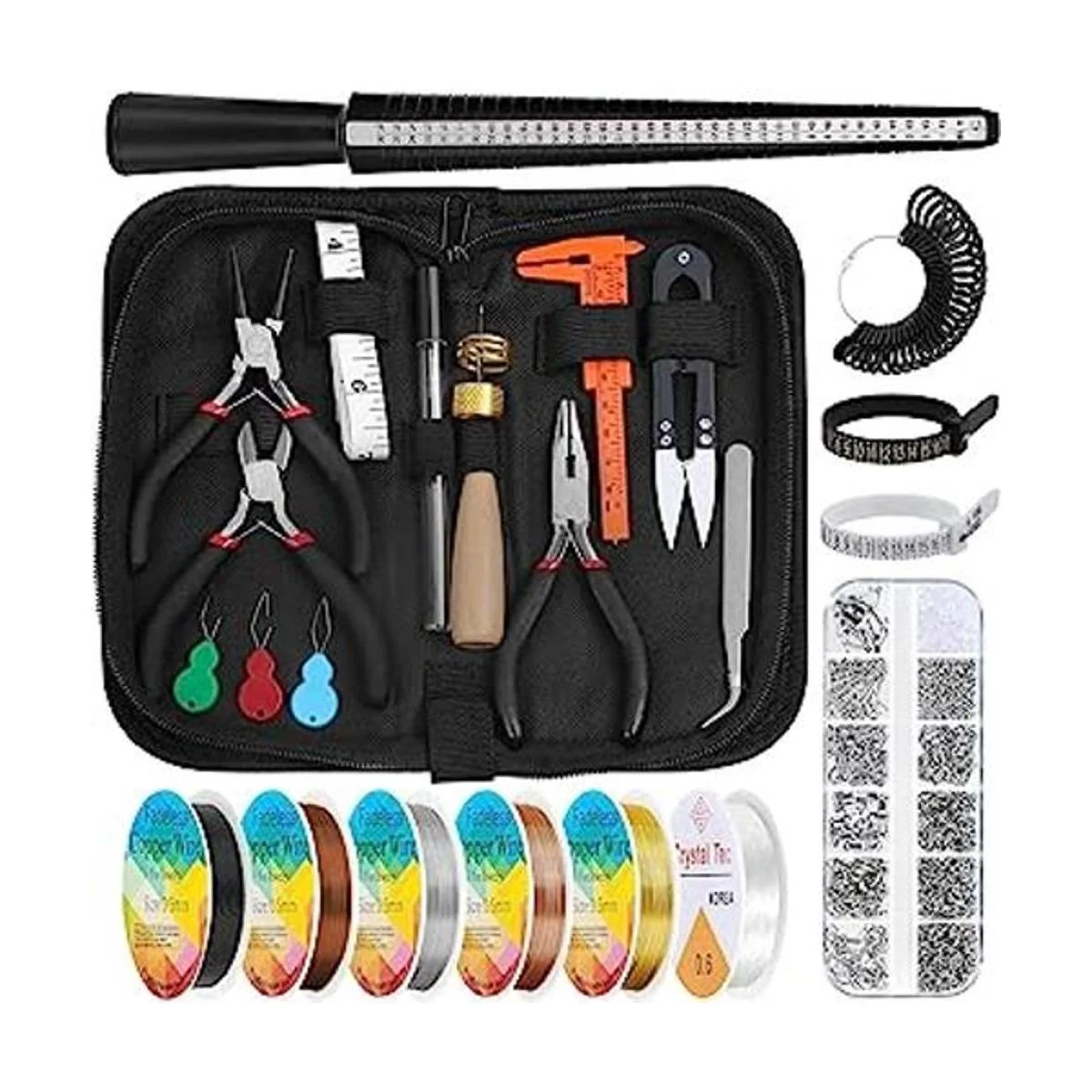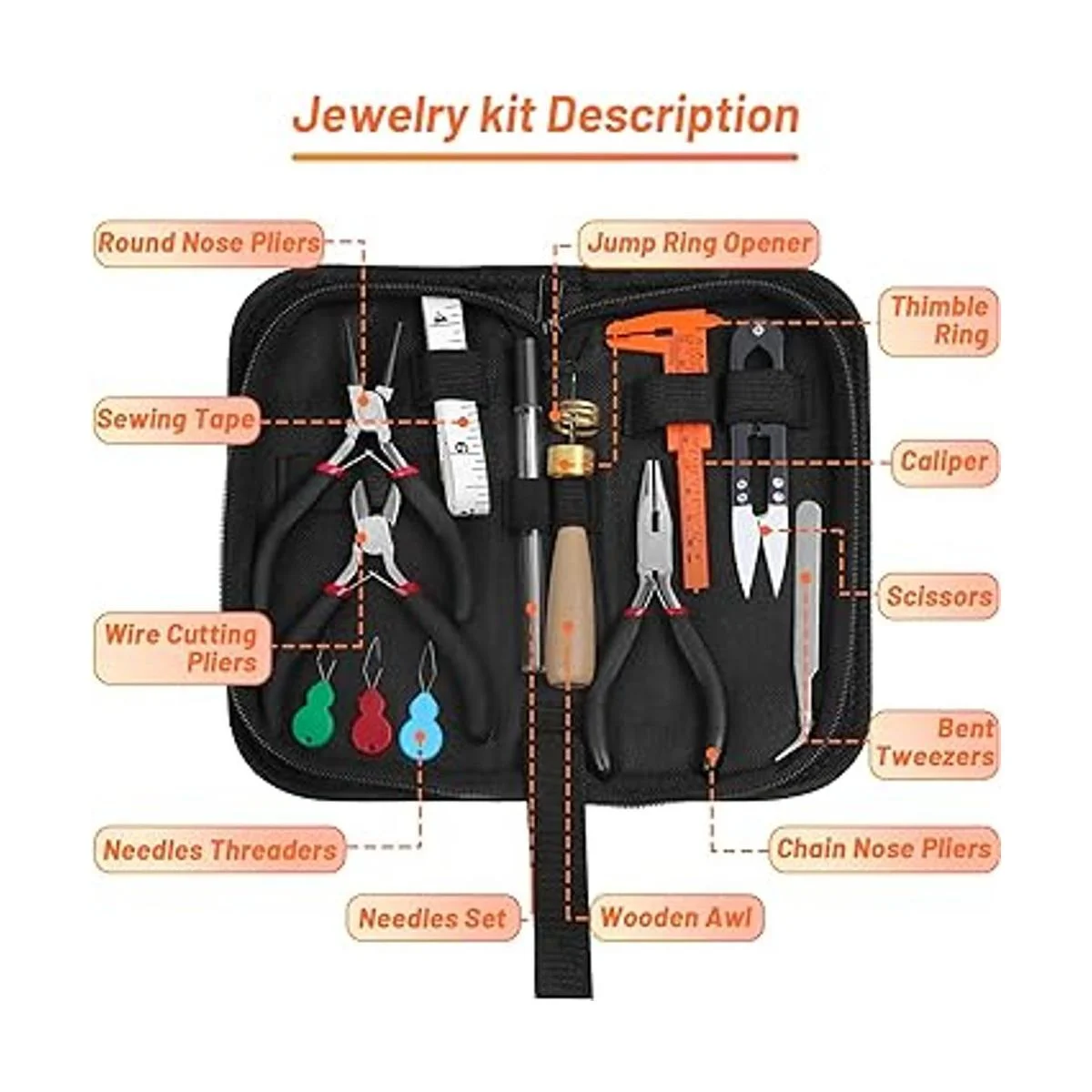 Kit de suministros para hacer joyas: el kit de herramientas para hacer joyas Audab viene con 4 herramientas de medición de anillos, 5 cables de joyería para hacer joyas, 3 alicates de manualidades de joyería, 1 cuerda de cuentas transparente, 6 agujas, 1 pinzas, 1 pinzas, 1 punzón, 1 abridor de anillos de salto, cinta métrica, bolsa con cremallera, 1 caja de accesorios de joyería. Perfecto para amantes de la fabricación de joyas profesionales y aficionados y principiantes para hacer proyectos de fabricación de joyas, cuentas de joyas, reparación de joyas, anillos de envoltura de cristal y otros proyectos de bricolaje