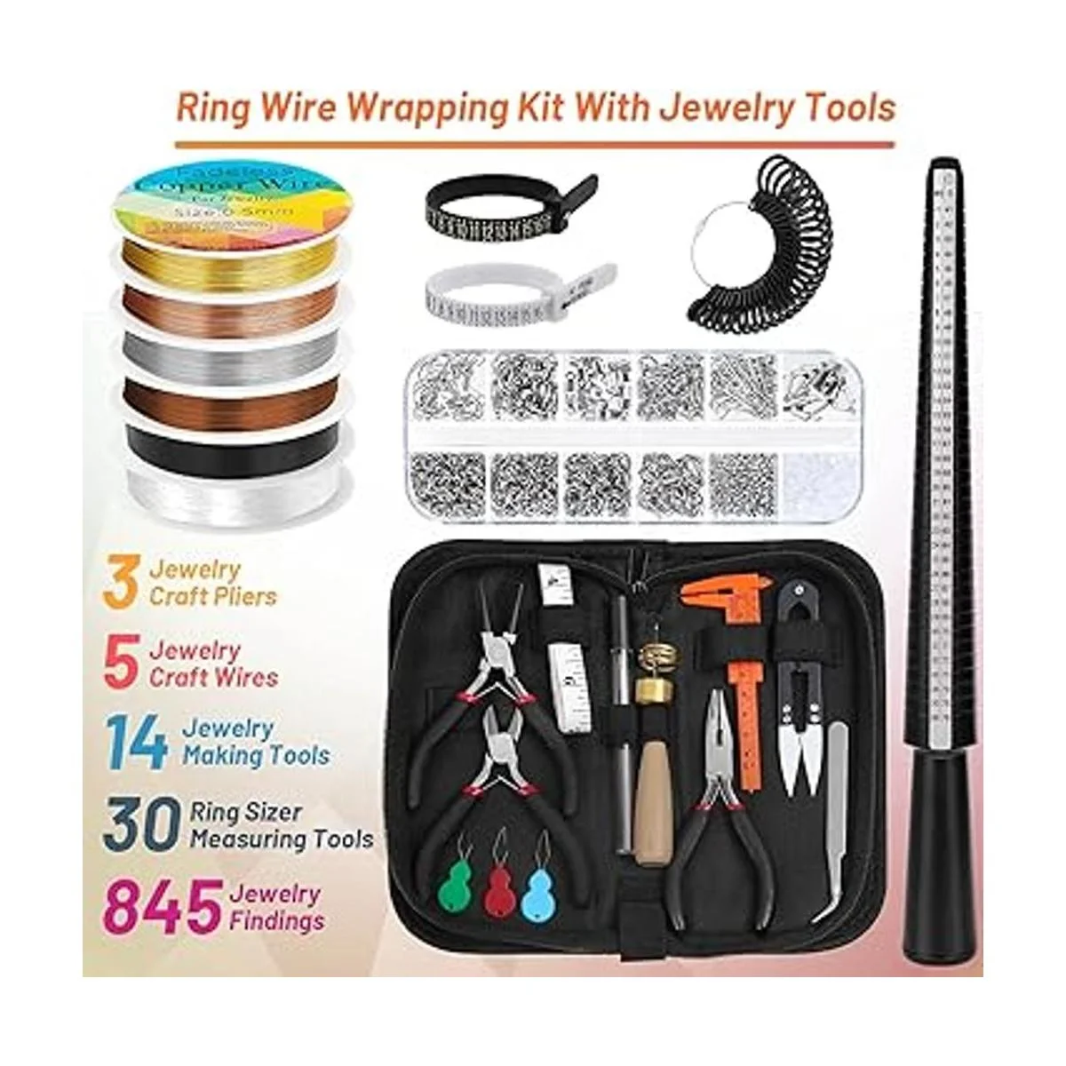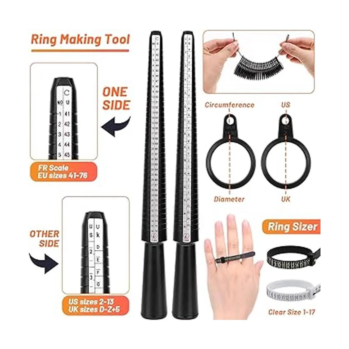 Audab Kit de suministros de fabricación de joyas, kit de herramientas de medición de anillos con herramientas de joyería, cables de manualidades de anillos, hallazgos de joyería y joyería para hacer anillos y reparación de joyas