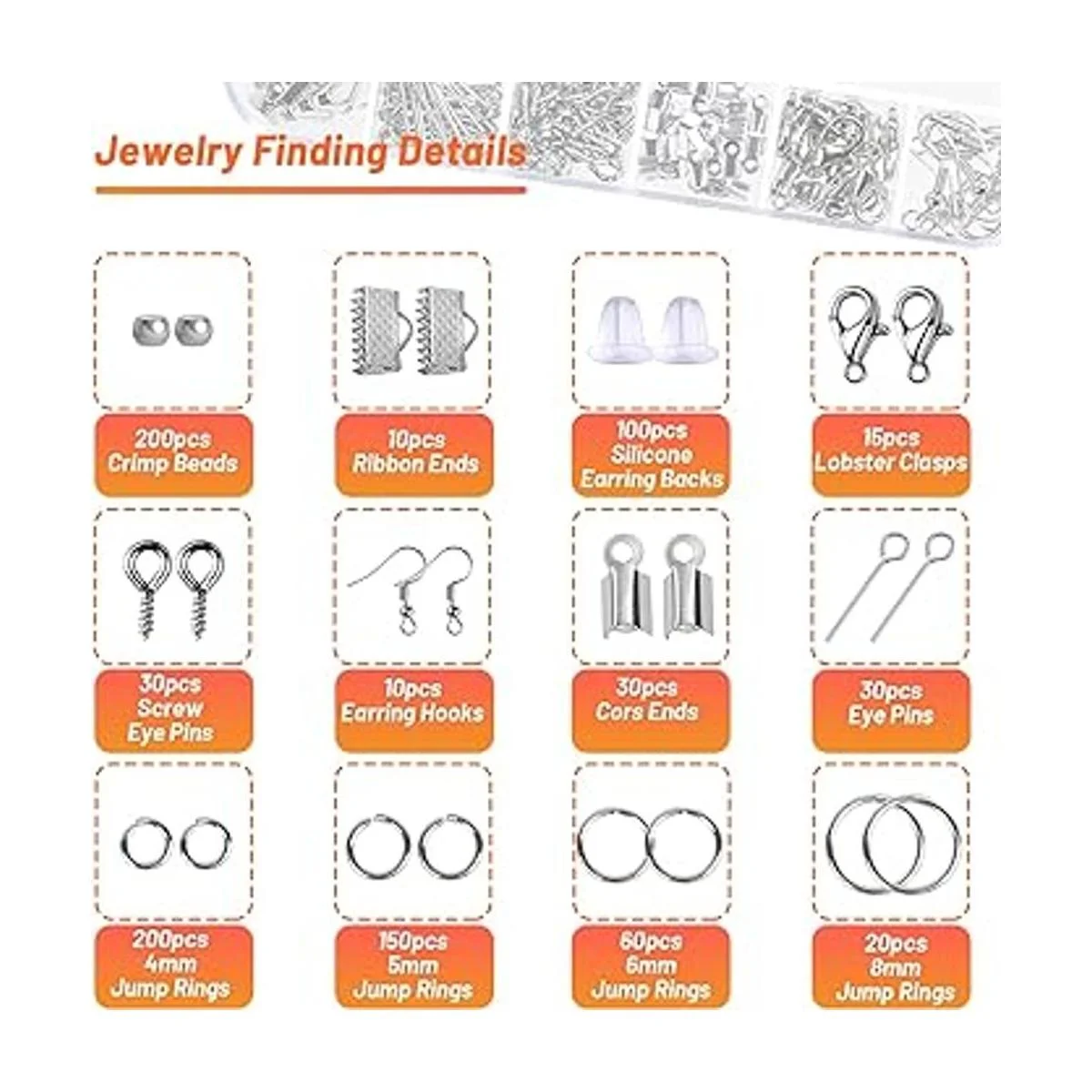 Suministros de búsqueda de joyas: con inclusión de 12 tipos diferentes de accesorios de joyería de anillos abiertos 0.157 in, 0.197 in, 0.236 in, 0.315 in, cierres de langosta, pasadores de ojo, cuentas de crimpado, ganchos de aretes, extremos de cinta, extremos de cordón y parte trasera de goma para aretes, cada tipo de hallazgo se empaqueta por separado en una caja