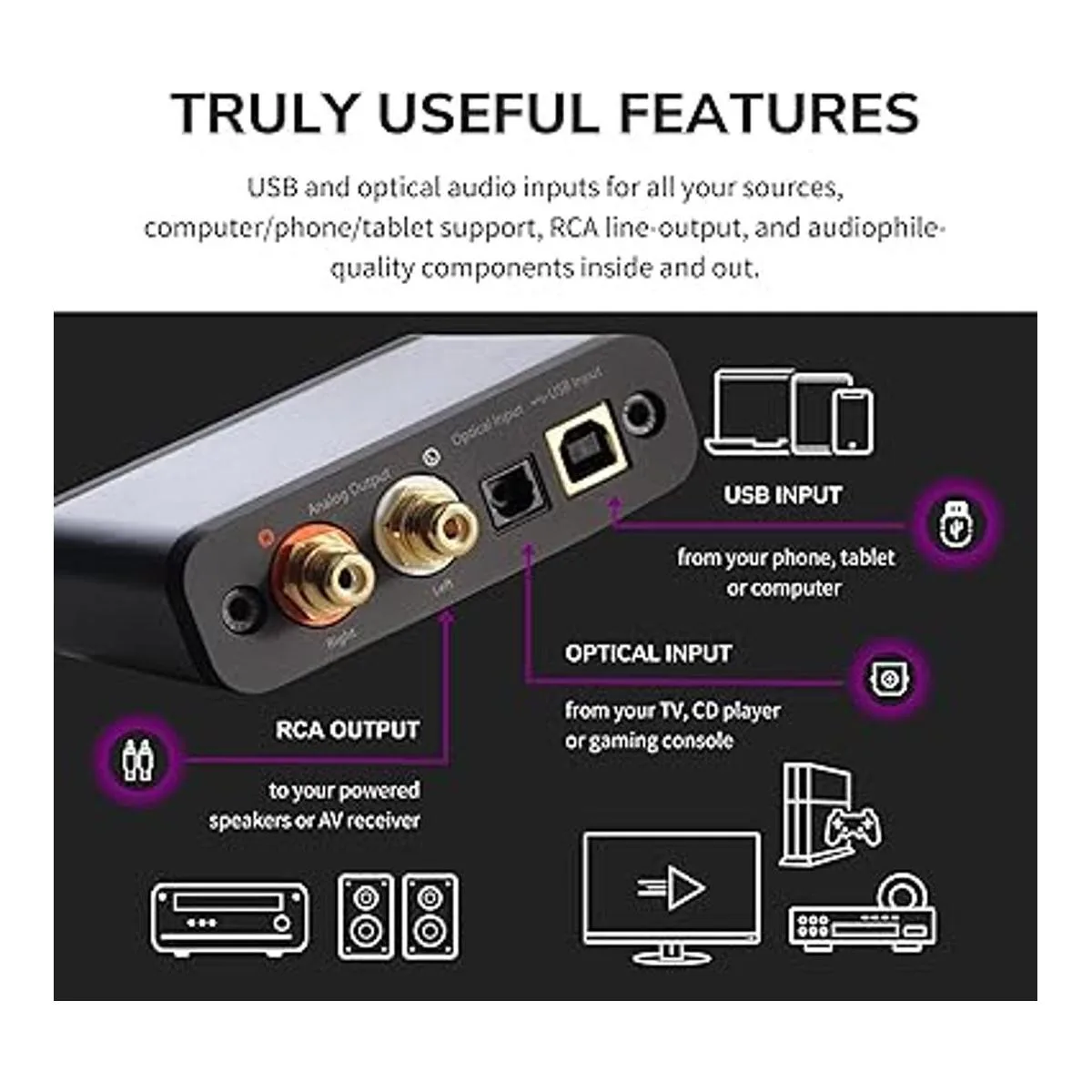 Características realmente útiles: entradas de audio USB y ópticas para todas tus fuentes, soporte de computadora/teléfono/tableta, salida de línea RCA, control preciso de volumen del panel frontal y componentes de calidad de audiófilo dentro y fuera. El D1 puede ser alimentado por un teléfono o tableta pero todavía conduce auriculares de alto rendimiento.
