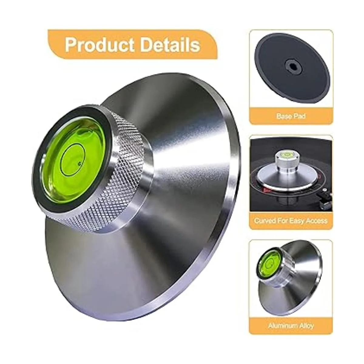 El diseño inferior de rosca mantiene la estabilidad del disco, protege el disco de fricción y daños, proporciona el nivel ideal de contacto entre la bandeja y el disco, reduce la vibración y aumenta la calidad de sonido LP, especialmente útil cuando un disco es ligero o tiene un agujero de eje suelto.
