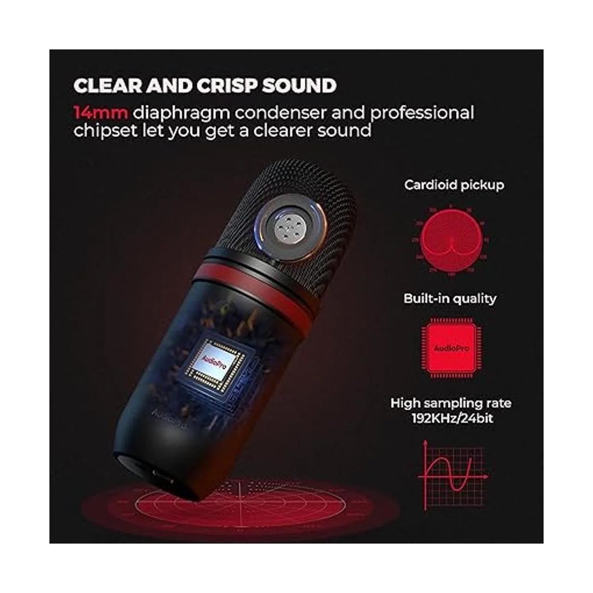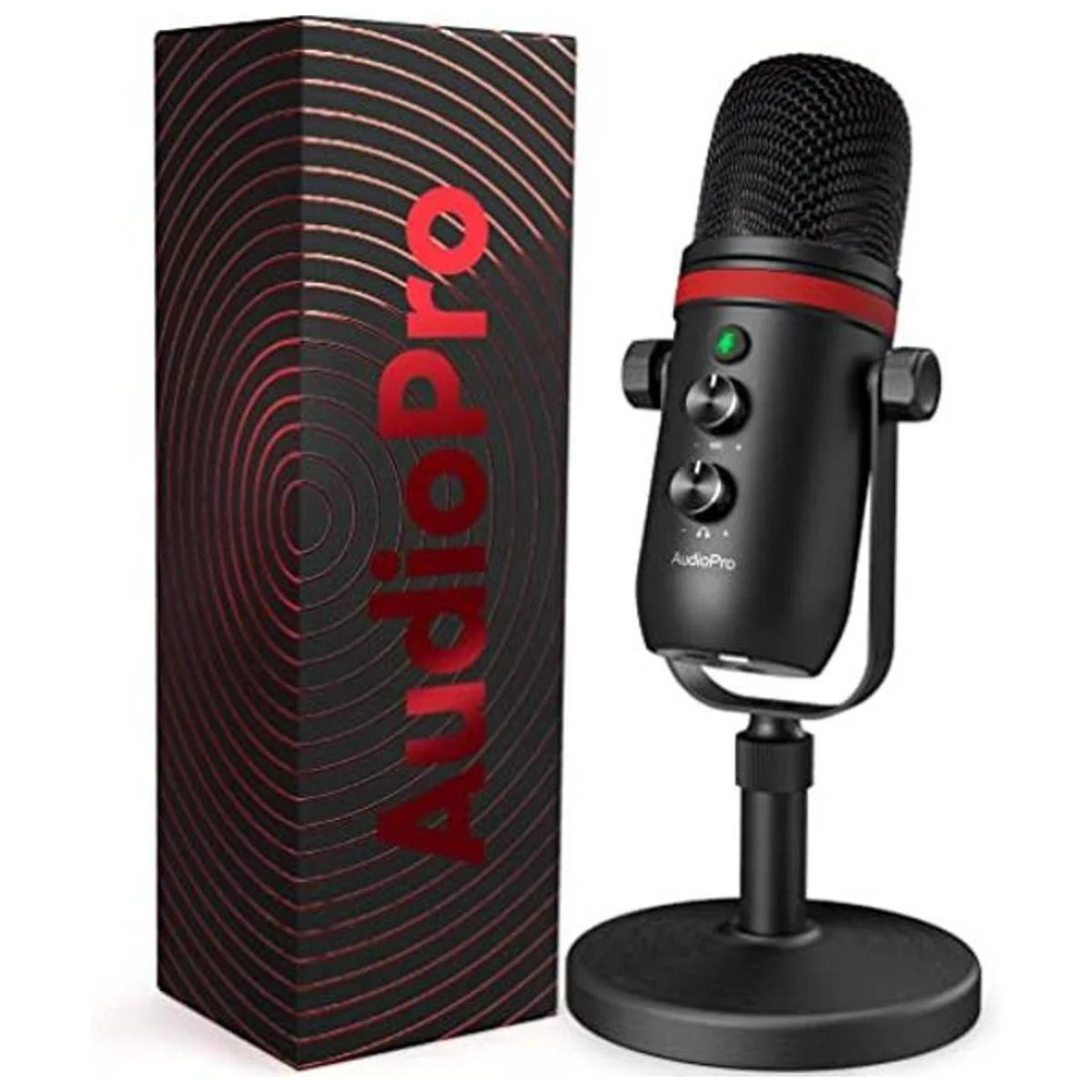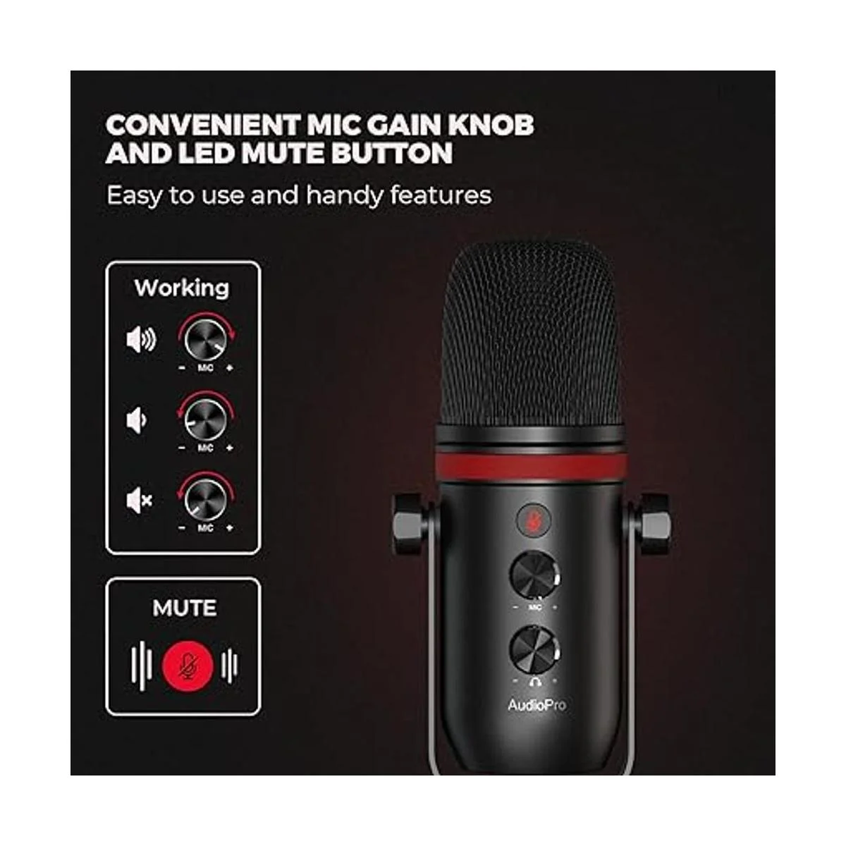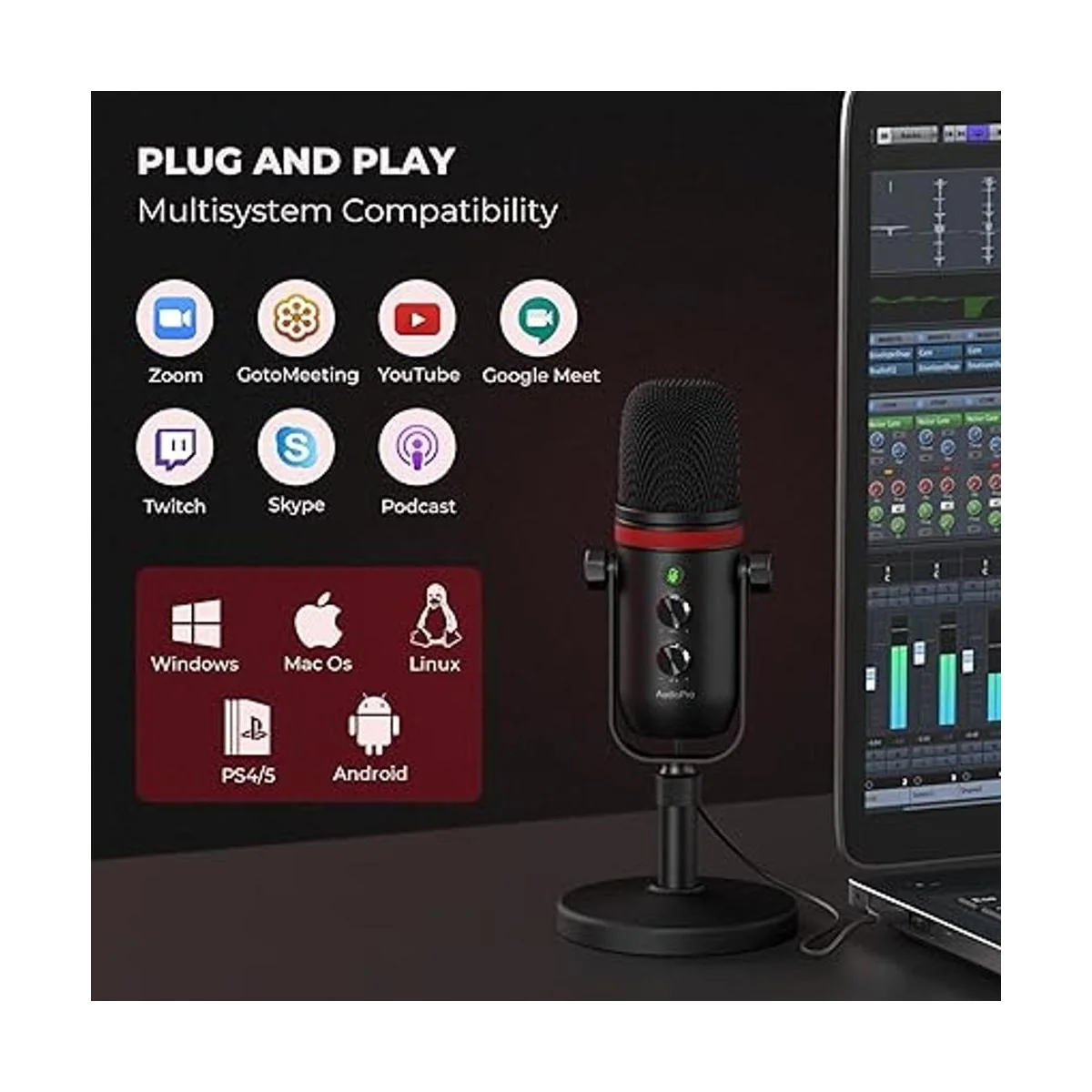 AUDIOPRO Micrófono USB Micrófono condensador de computadora para PC, laptop, teléfonoPS45, salida de auriculares, control de volumen, USB tipo C Plug and Play, botón de silencio LED, para transmisión, podcast, grabación de estudio