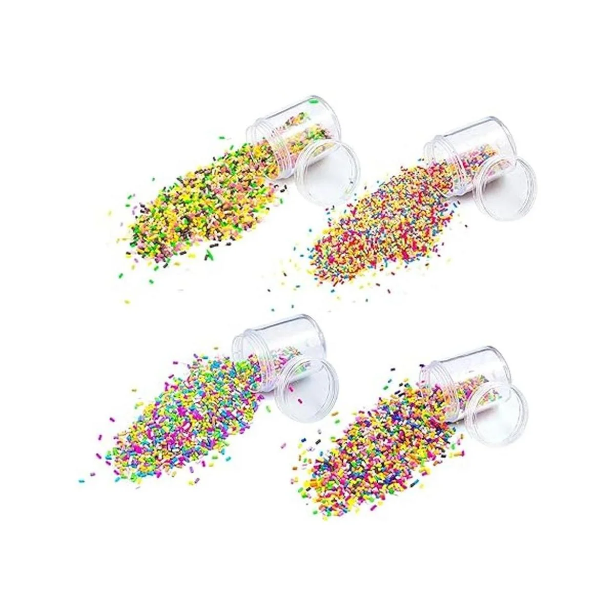 El paquete incluye: 4 paquetes de varios tipos de chispas, 2.82 oz de dulces falsos de colores, 4 colores, cada color 0.71 oz, cada tipo de mini espolvoreo está empaquetado en una botella de plástico transparente.