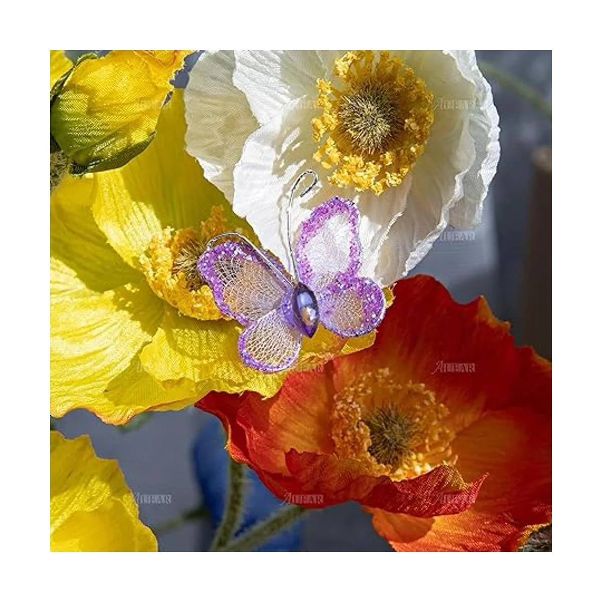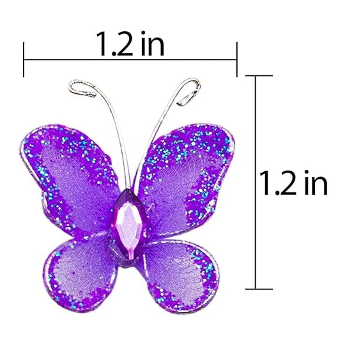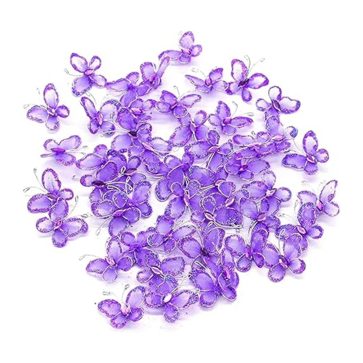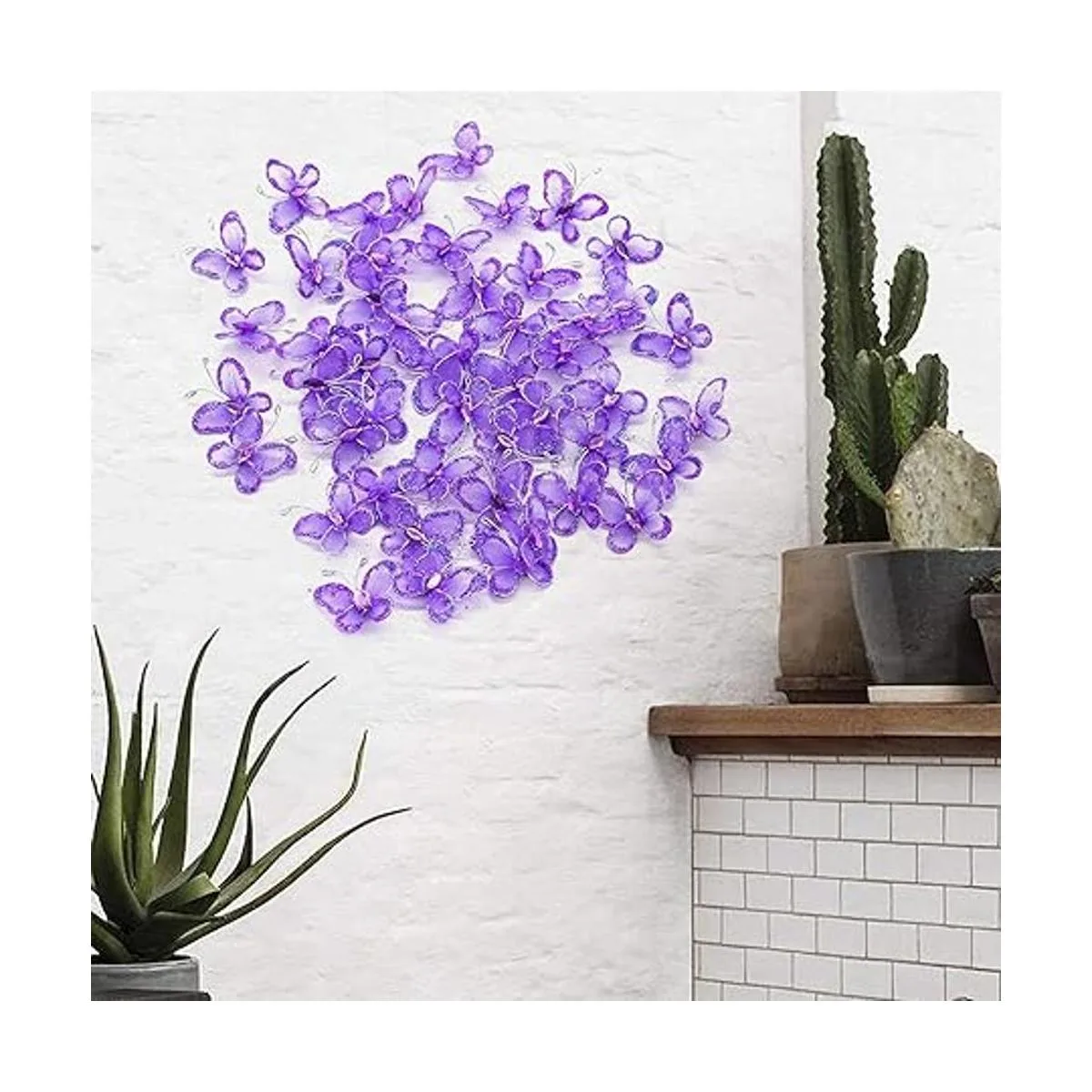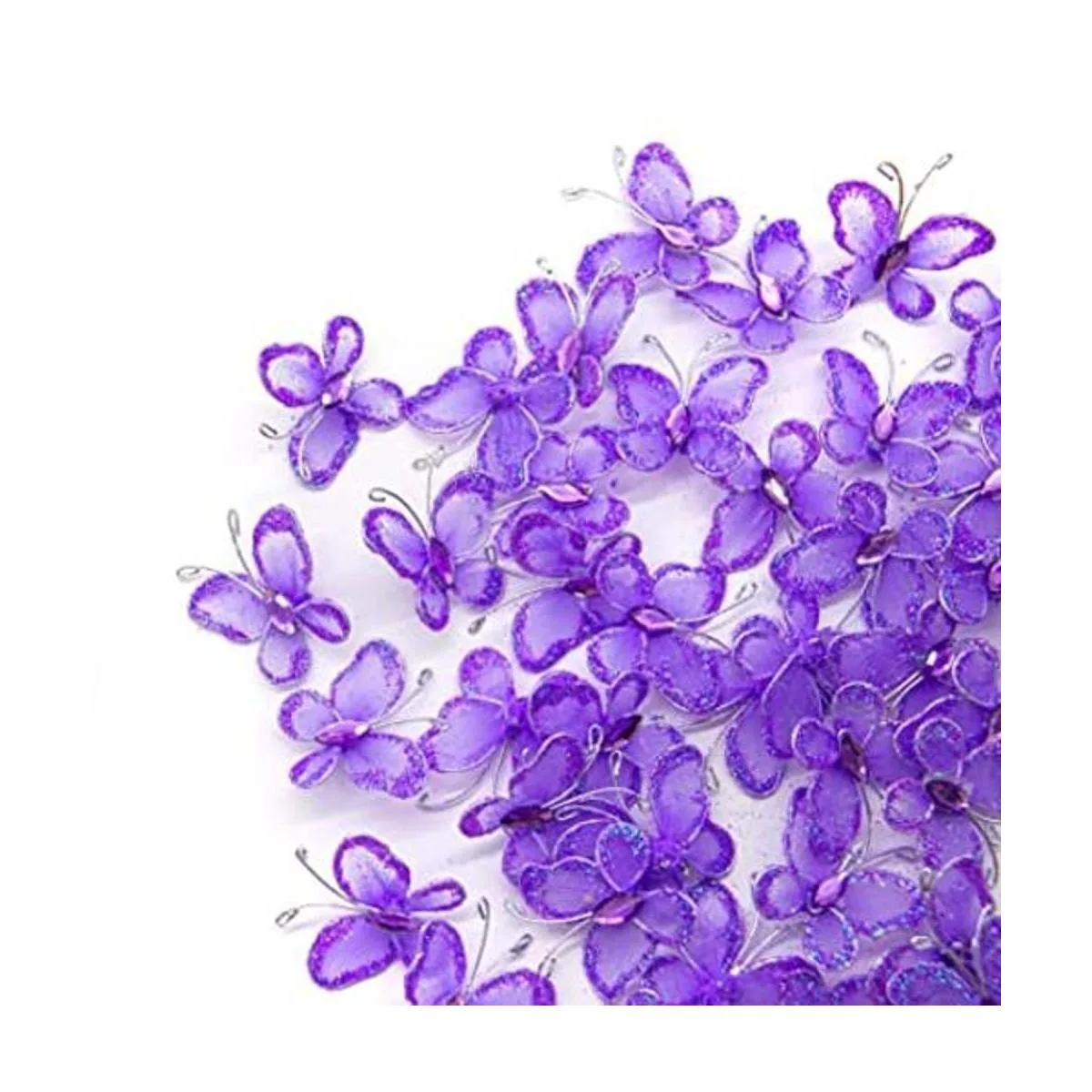 AUEAR, Paquete de 50 mariposas de malla transparente con purpurina de alambre con gema para decoración del hogar y la boda, decoración de pared de fiesta color morado