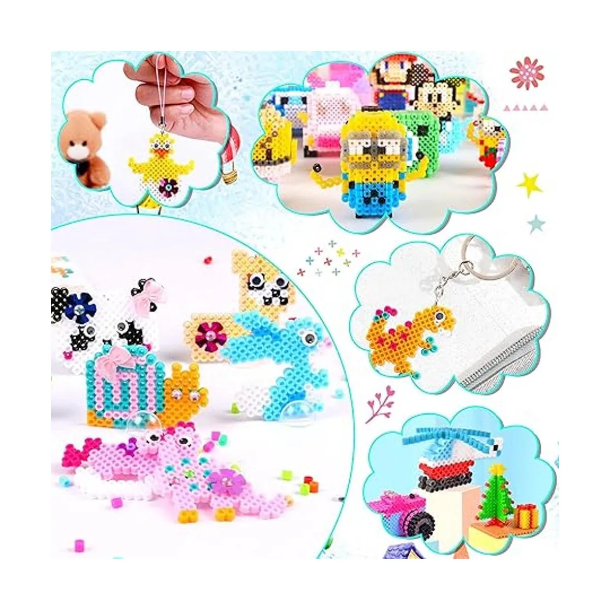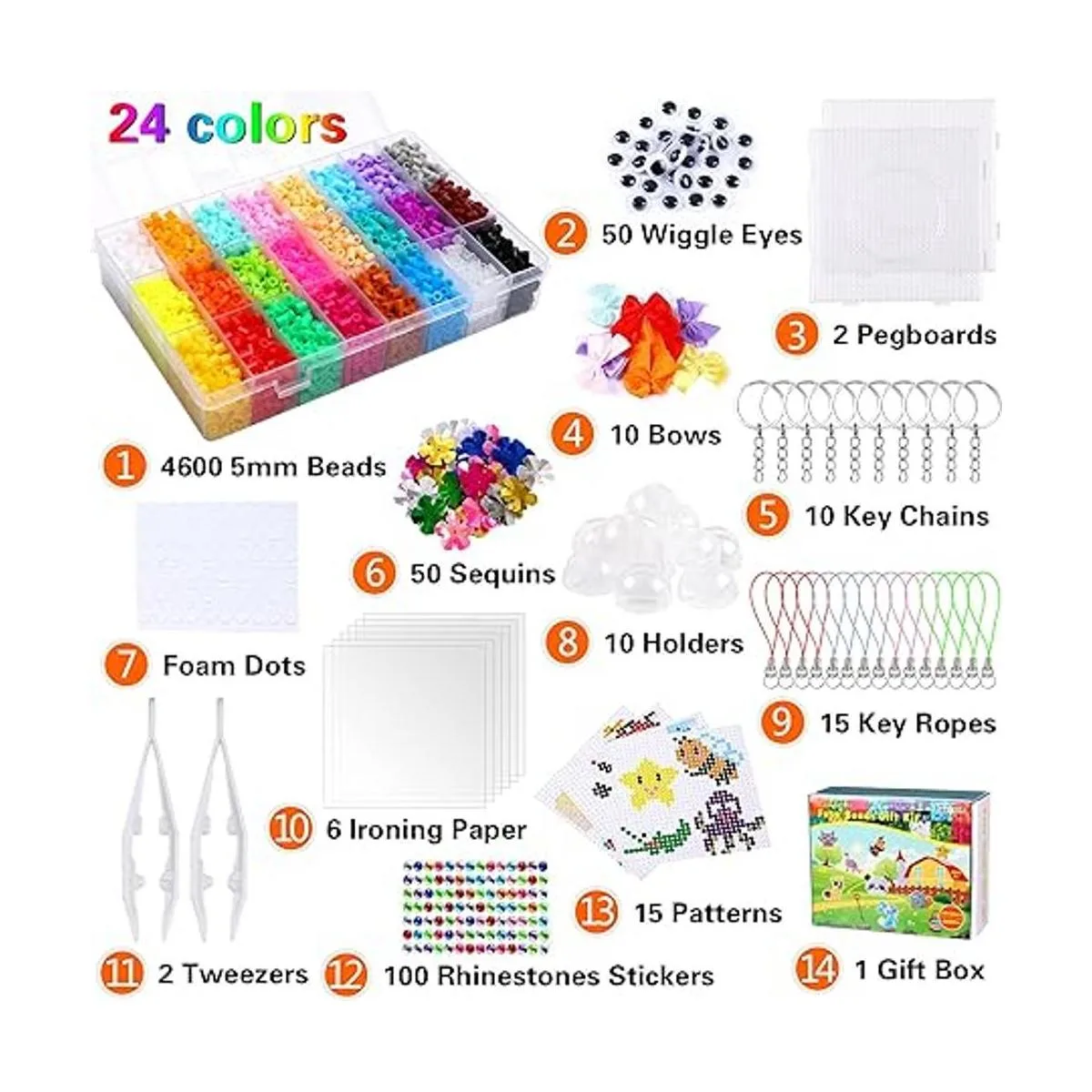 Juego de regalo de cuentas fusibles de valor: recibirás un juego de caja de regalo de gran valor, incluyendo más de 4600 cuentas de fusible de 24 colores, 15 patrones, 2 tableros de clavijas, 6 papel de planchado, 15 cuerdas para llaves, 10 soportes, 10 lazos, 50 ojos de movimiento, 50 lentejuelas, 100 calcomanías de diamantes de imitación, 60 puntos de espuma, 2 pinzas ers y 1 regalo caja. Cantidad abundante, patrón rico y accesorios creativos son el regalo ideal para los niños.