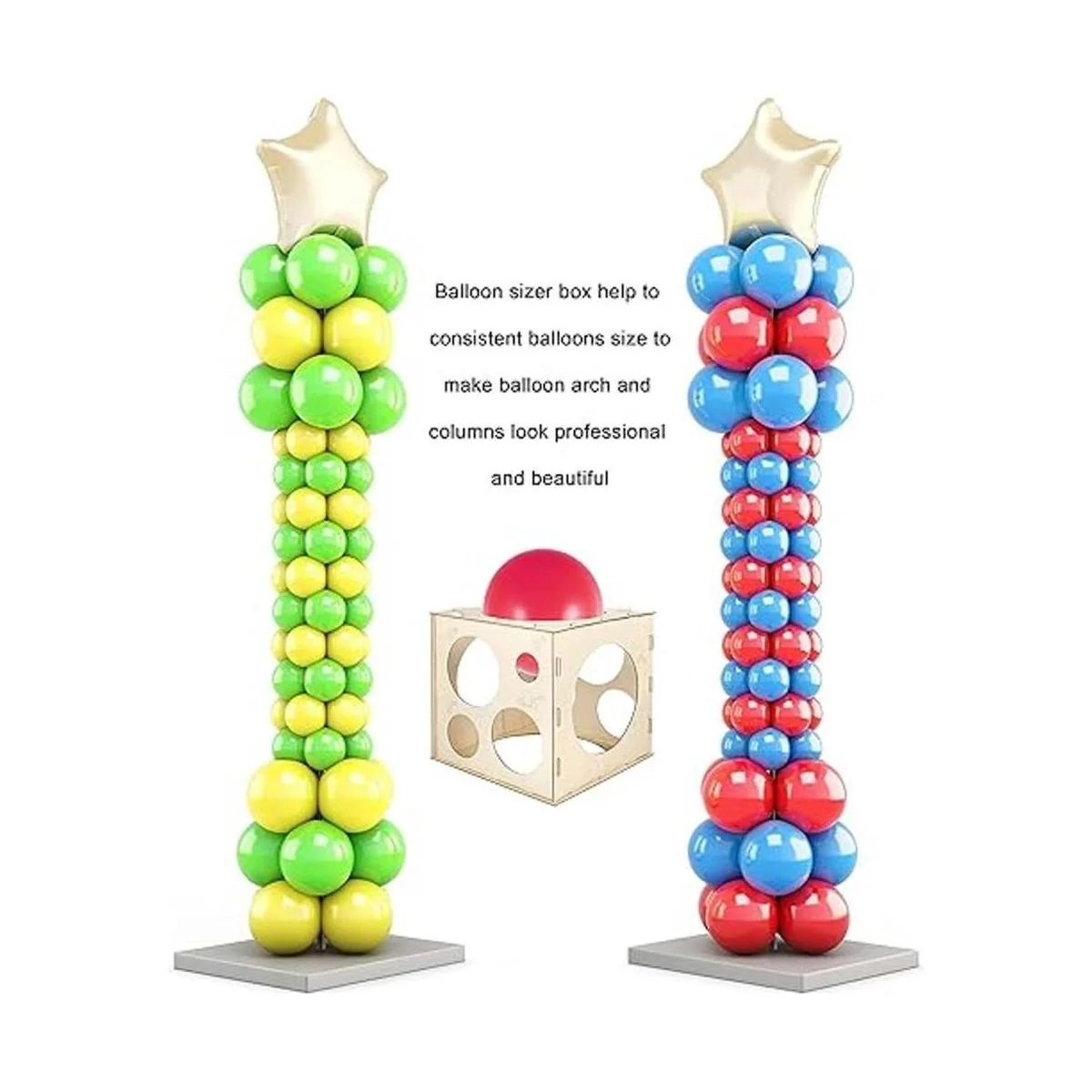 Cubo medidor de globos: hay 12 agujeros con 12 marcadores de tamaño. Ideal para todas las ocasiones de globos de bricolaje, los globos en tamaños consistentes harán que los arcos y columnas de globos se vean más organizados y agradables