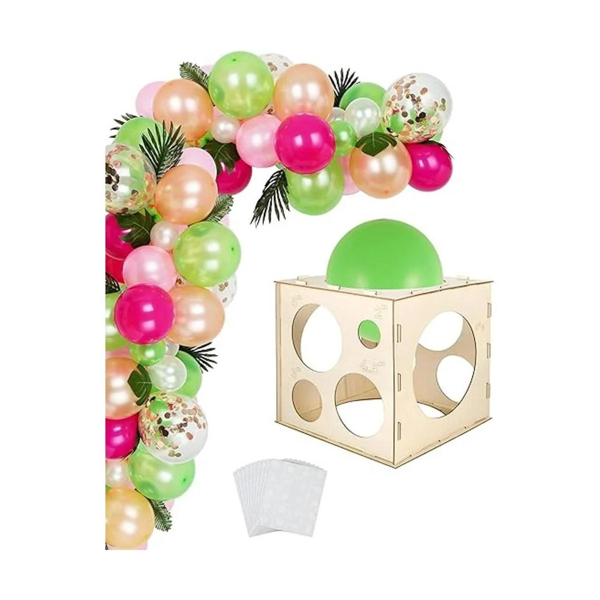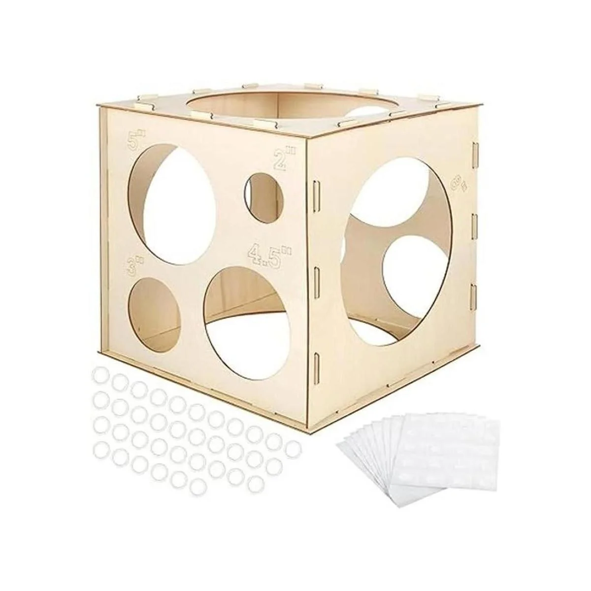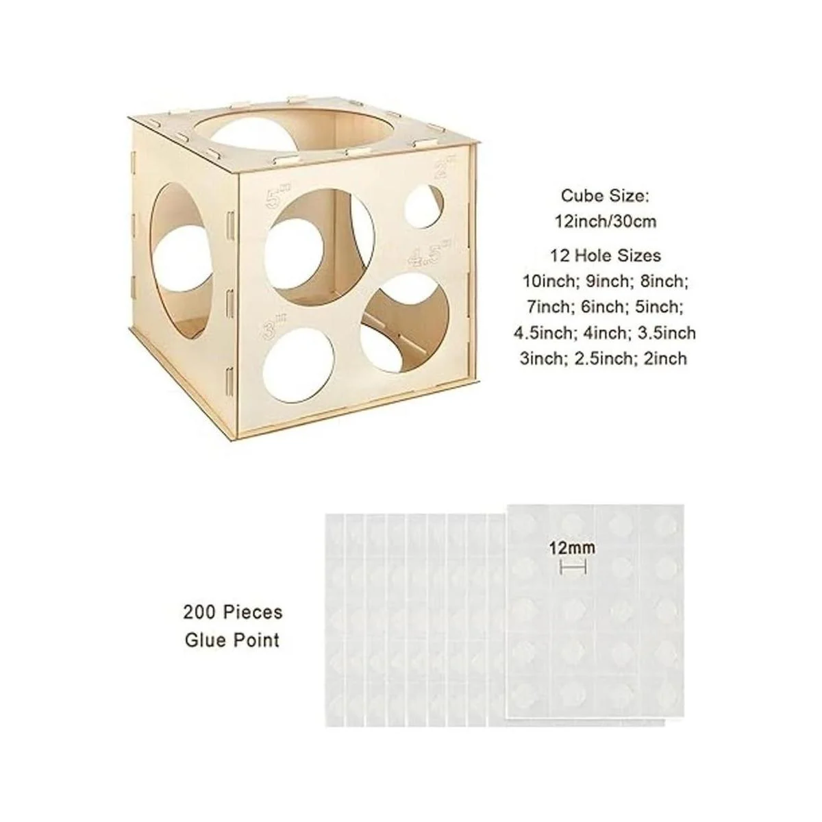 Auihiay Caja de cubo de madera de 12 agujeros con 200 puntos de pegamento para globos, herramienta de medición plegable de tamaño de globo para guirnalda de globos, columnas, globos y arcos de globos 210 pulgadas