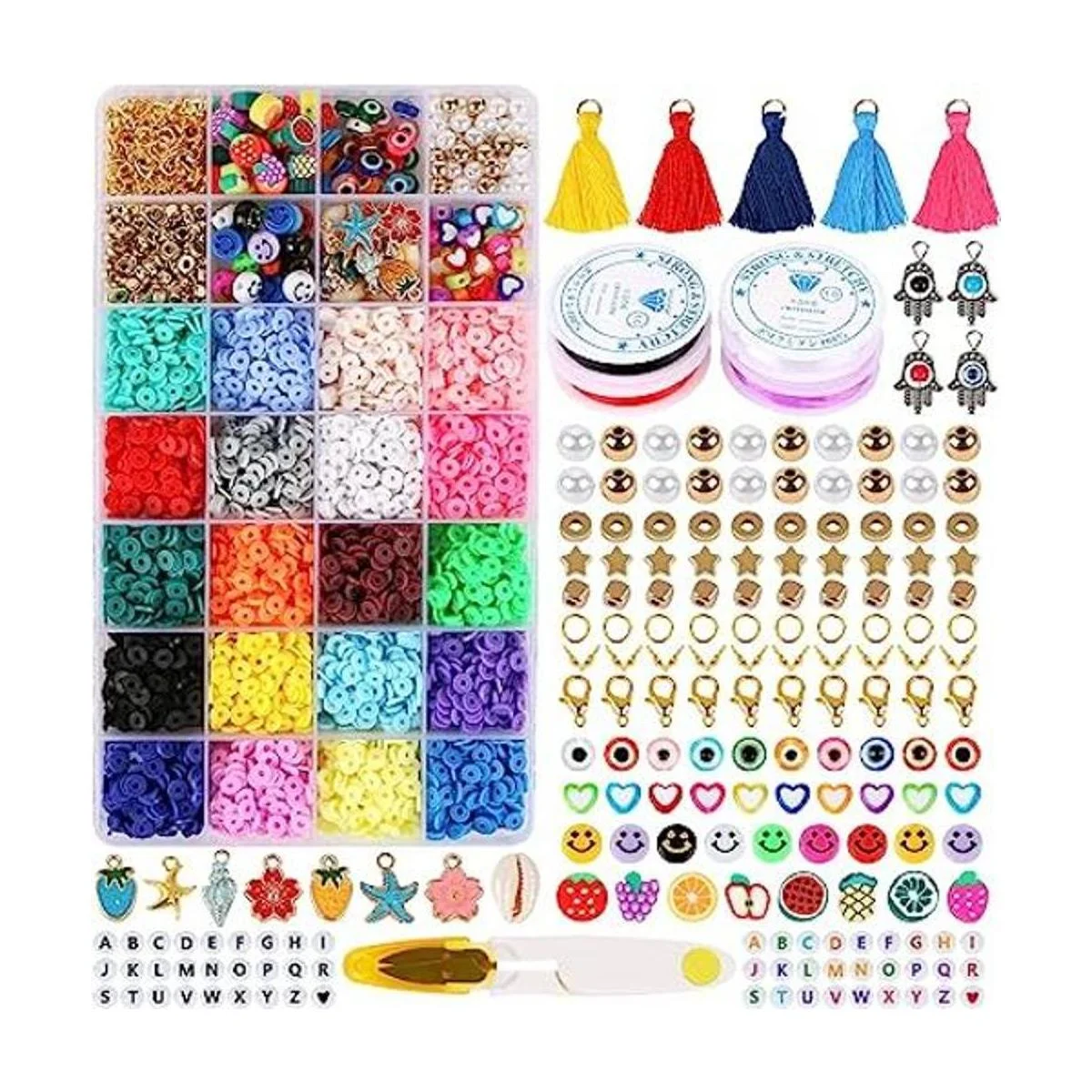 Todo lo que necesitas incluido Una caja de suministros para hacer joyas de alrededor de 4000 cuentas de arcilla plana en 20 colores y 560 abalorios contiene cuentas redondas de estrella, espaciadores cuadrados, coloridas cuentas de mal de ojo, cuentas de cara sonriente, cuentas de fruta, cuentas de letra, colgantes, anillos, cierre de mosquetón, borlas, etc. 4 rollos de cuerdas elásticas de 16.4 ft de diferentes colores, unas tijeras color al azar para satisfacer todas tus necesidades para hacer joyas.