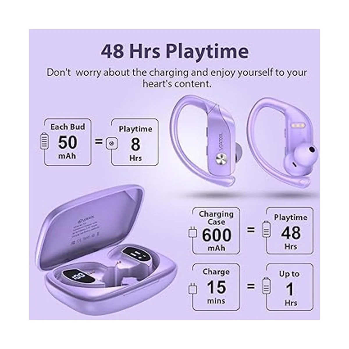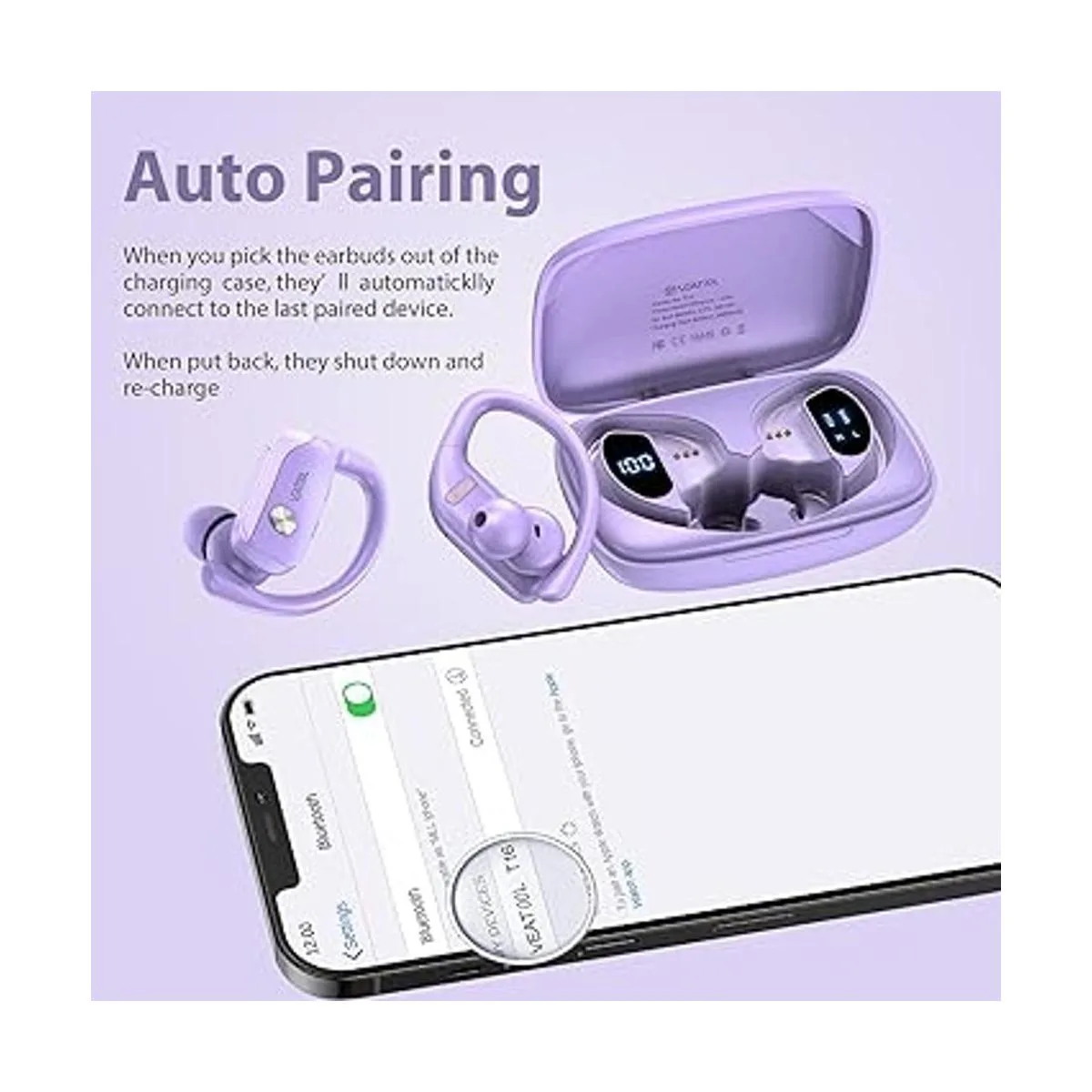 Auriculares inalámbricos Bluetooth de 48 horas, auriculares deportivos con pantalla LED sobre las orejas con ganchos para las orejas, auriculares de micrófono integrado para entrenamiento, color morado, BMANIVEAT00L