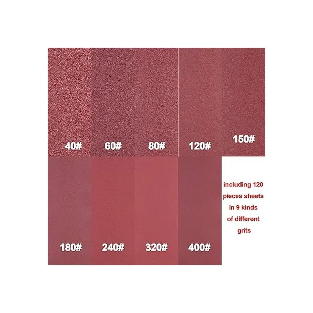 Práctico paquete: incluye 120 hojas en 9 tipos de granos diferentes, de grueso a fino: 40 60 80, 10 hojas para cada grano; y 120, 150, 180, 240, 320, 400, 15 hojas para cada grano