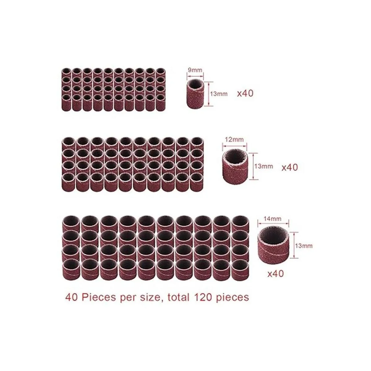 El paquete incluye: 120 bandas de lijado en 3 diámetros: 1/2, 3/8 y 1/4, 40 piezas por tamaño; y 12 piezas de tambor de lijado de vástago en 3 diámetros: 1/2, 3/8 y 1/4, 4 piezas por tamaño; total 132 piezas