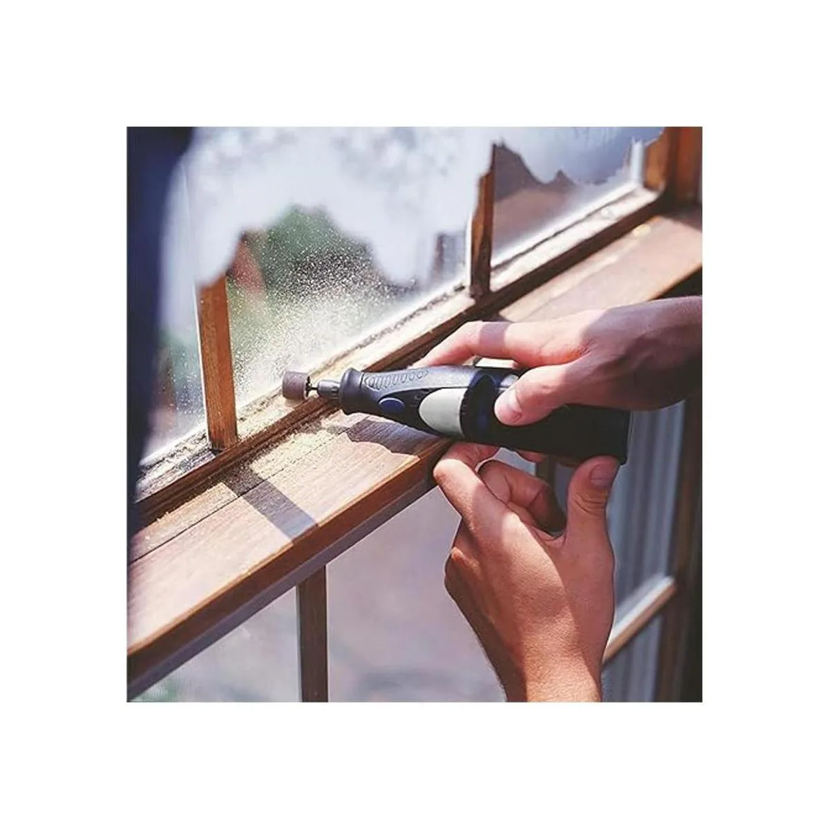 Nota: usa gafas de seguridad profesionales para proteger tus ojos, porque tal vez haya granos voladores cuando el tambor de lijado gire a alta velocidad; el tambor de lijado se atraerá más rápido en la superficie de metal, reemplaza las mangas oportunamente para lograr el mejor efecto de lijado
