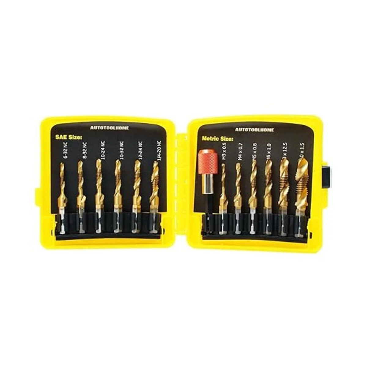 AUTOTOOLHOME Juego de brocas de titanio con combinación de 13 brocas SAE y métricas para taladrar roscas de tornillo, desbarbado avellanado