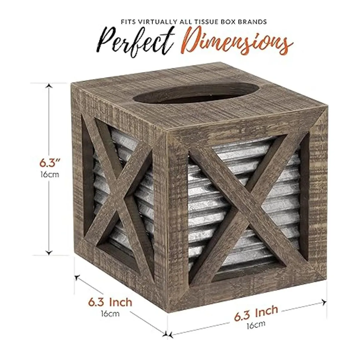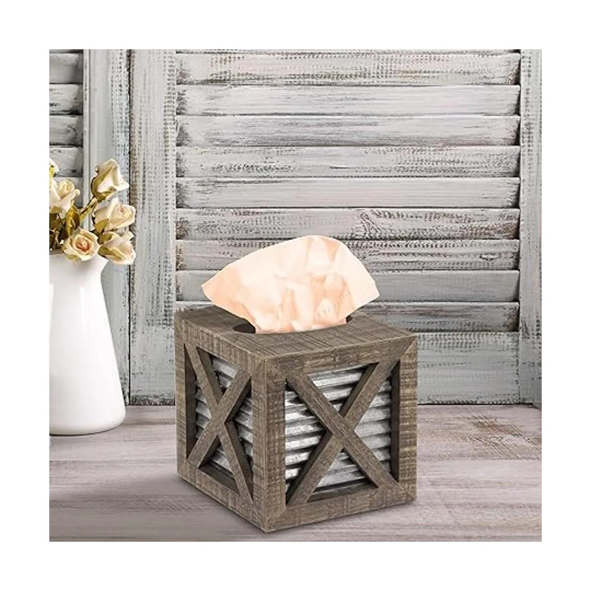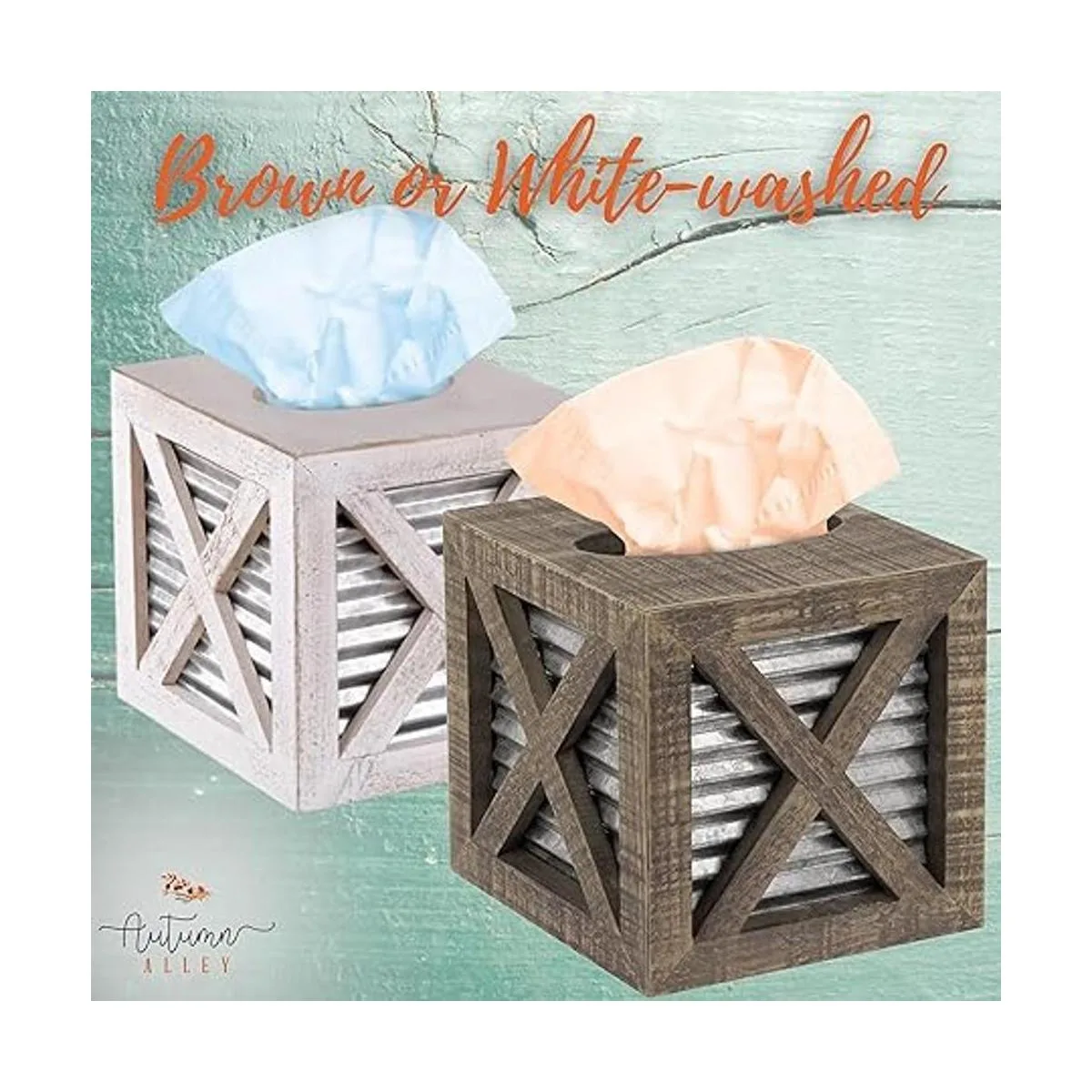 Autumn Alley Funda cuadrada rústica para caja de pañuelos Accesorios de baño de granja Soporte de pañuelos rústico para decoración de baño Cubierta de caja de pañuelos de madera con decoración galvanizada