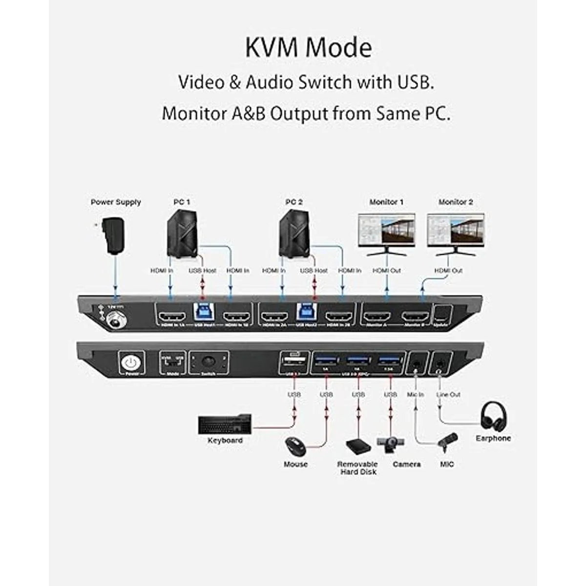 El PC host debe tener dos conexiones HDMI al interruptor KVM, entonces puede obtener imágenes en monitores duales, si solo tiene una conexión HDMI, entonces obtendrás una sola pieza.