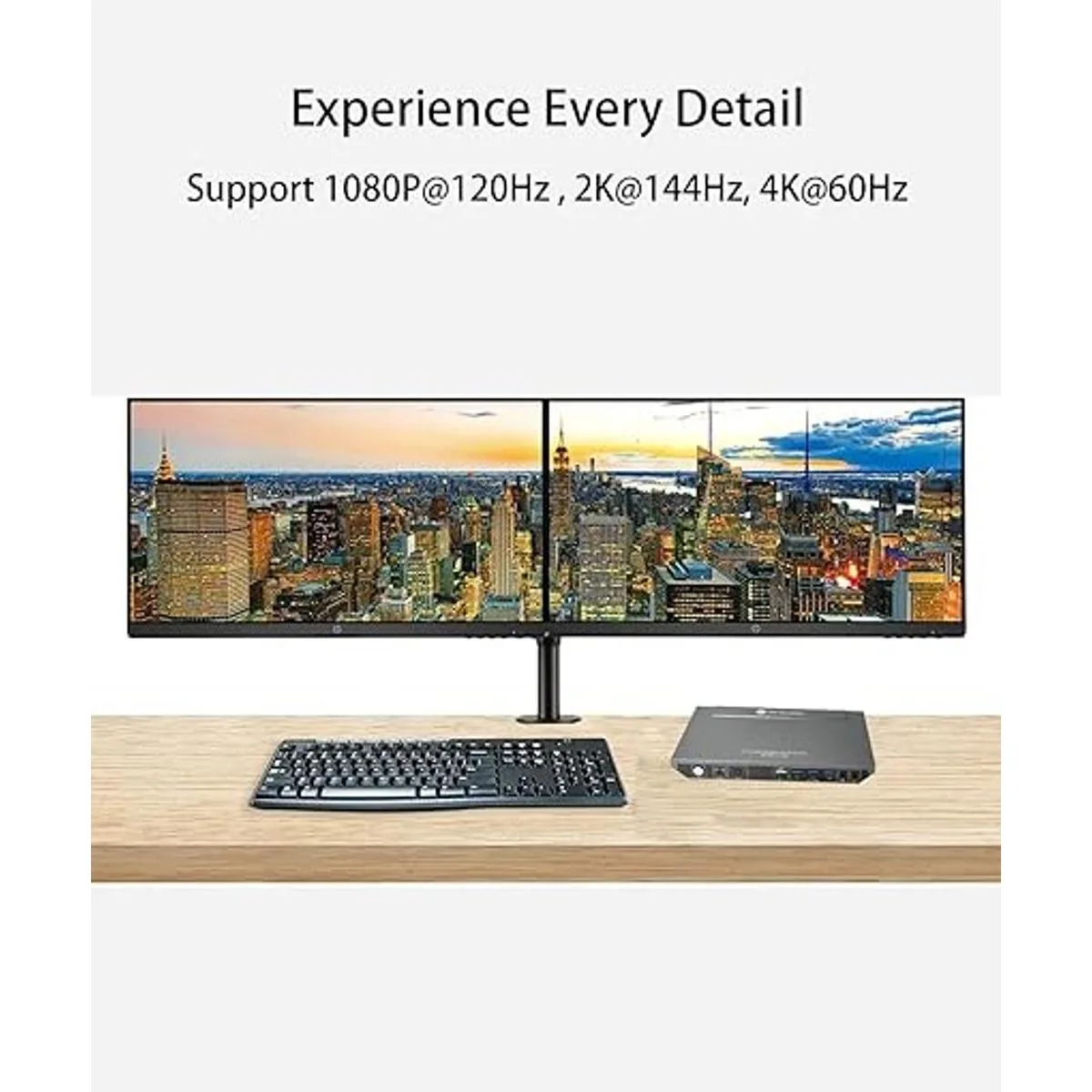 Soporta resolución máxima de hasta 4096 x 2160 60 Hz, 2560 x 1440 60 Hz, y compatible con hacia abajo dependiendo del soporte de tarjeta gráfica, monitor y adaptadores si se utiliza alguno; soporta detección automática y función de memoria en caso de apagado; también soporta audio y micrófono separados puertos.