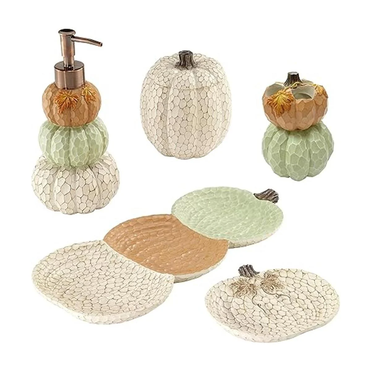 Halloween o cosecha Grateful Patch aporta estilo y diseño a una colección temática de cosecha de accesorios de baño y toallas en texturas de panal y tonos de temporada de verde, naranja y marfil.