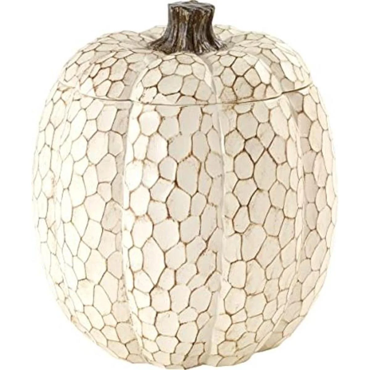 Elegante y sin miedo: mantente en el espíritu con este tarro decorativo que es una calabaza figural, en color marfil. Pintado a mano en resina texturizada para resaltar contrastes y sombreado en la pieza.