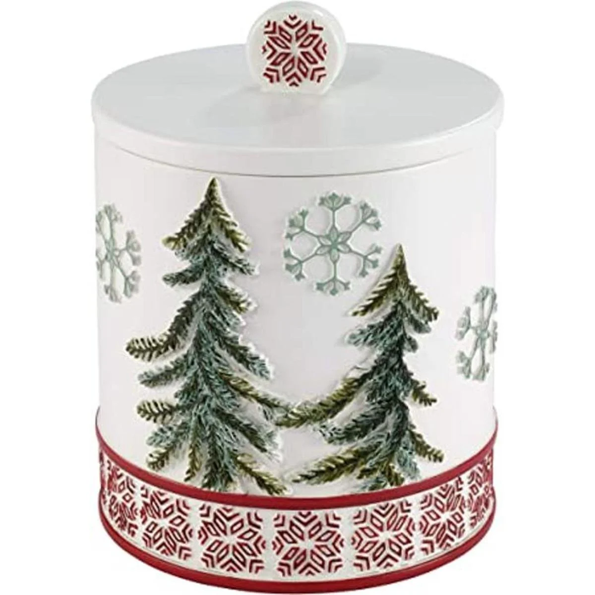 Almacenamiento festivo: este tarro de tocador cuenta con una escena de invierno artísticamente representada, con árboles perennes en alivio, copos de nieve plateados y el borde a juego de copo de nieve rojo en la parte inferior.