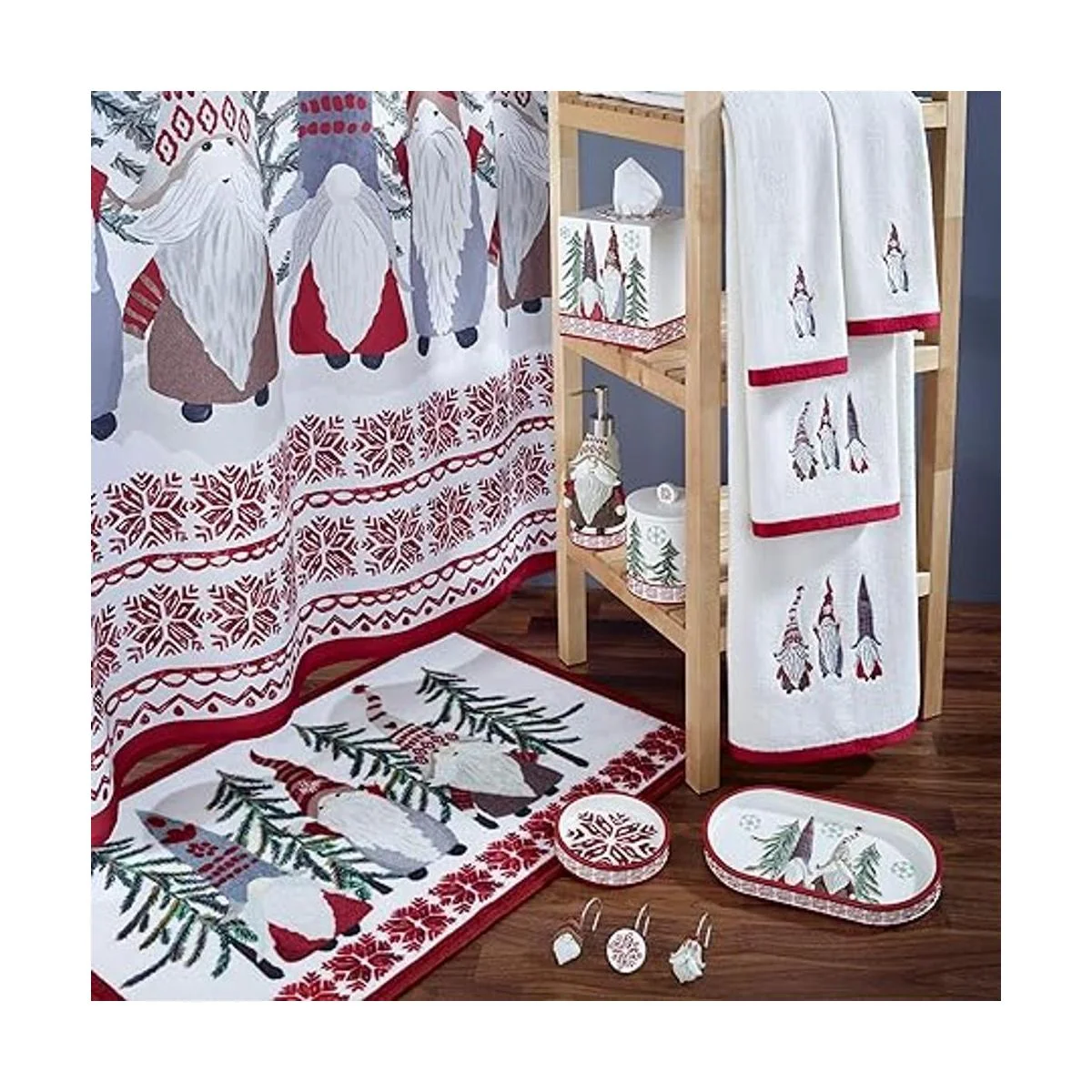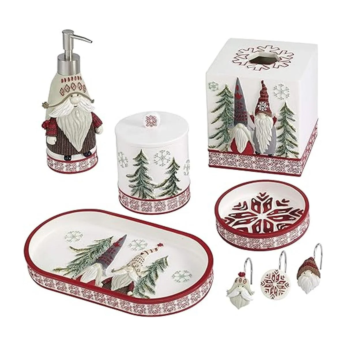 Gnomos: un gnomo Tomte el gnomo vestido festivo es la pieza central de esta colección de accesorios de baño. Coloridos sombreros flexibles, arboledas de árboles de abeto y bordes de copo de nieve rojos completan este adorable diseño navideño.