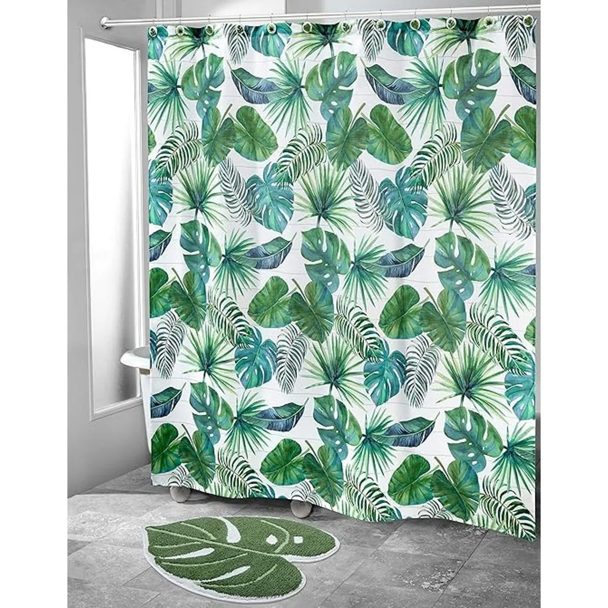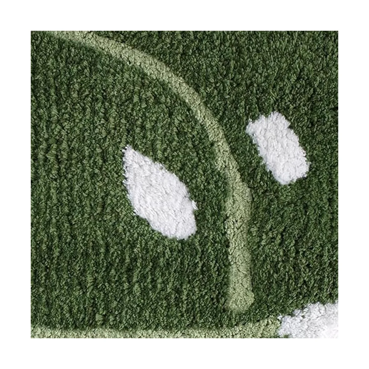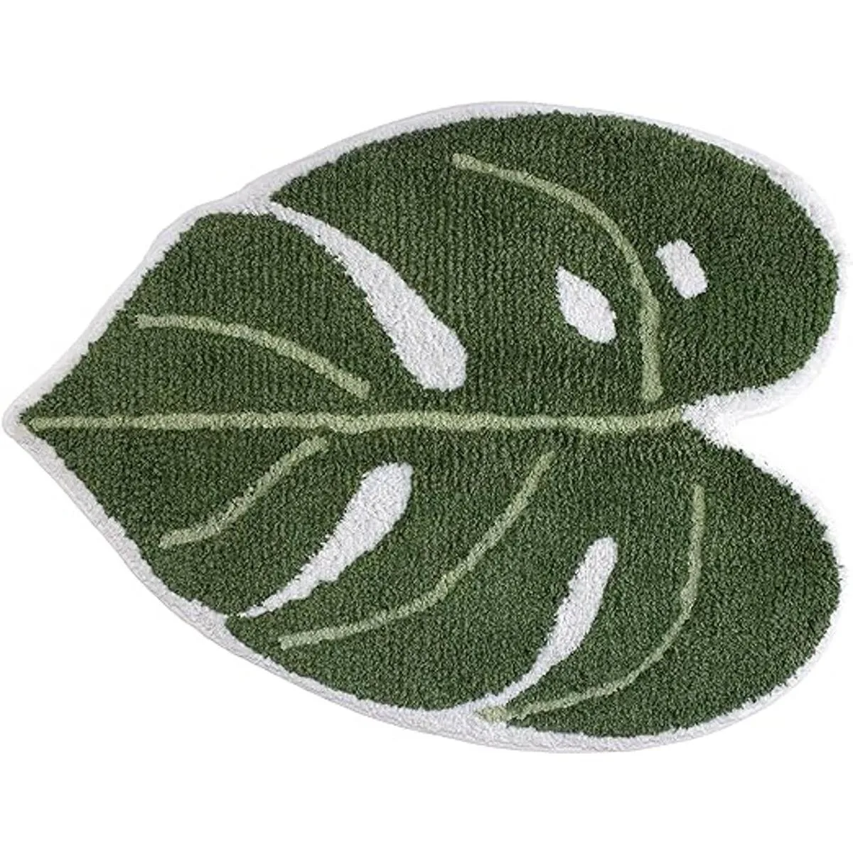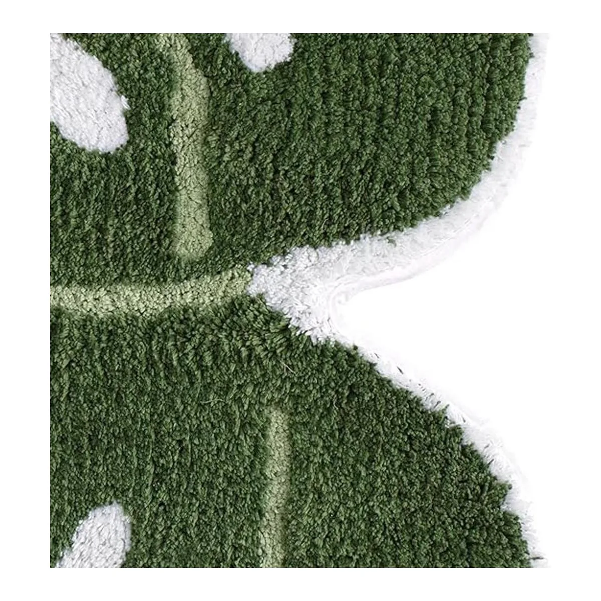 La alfombra decorativa de baño de la colección Viva Palm es una hoja de filodendro dividida figural, con sombra de color blanco y verde.