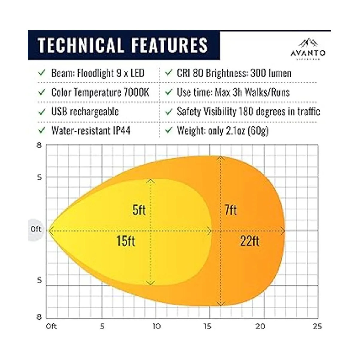 AVANTO PRO Luz de correr con clip, original, 300 lúmenes, luz LED de 2 a 3 horas, luces de correr nocturnas recargables USB para corredores, trotadores, equipo de correr nocturno para pasear perros, complemento de chalecos reflectantes