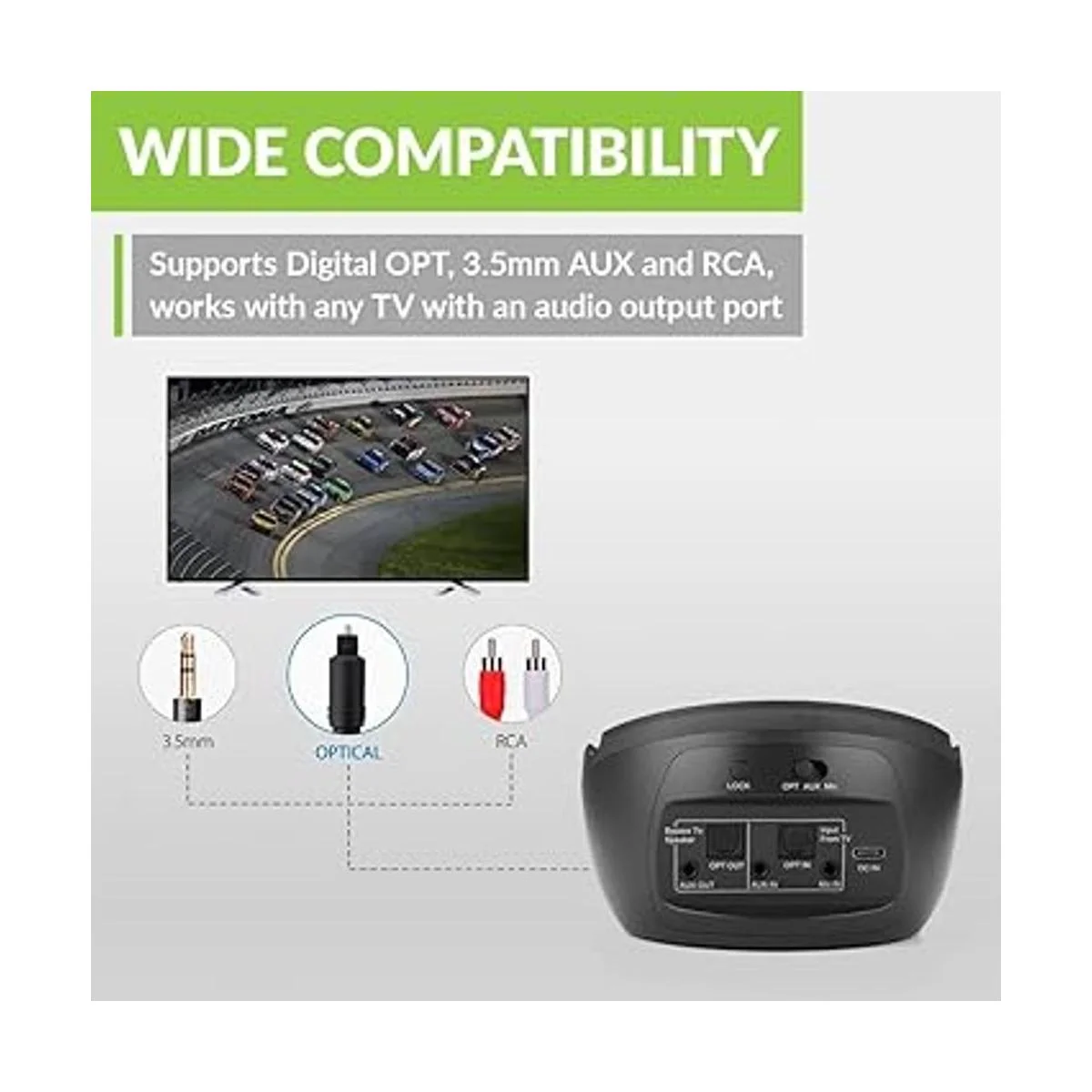 Configuración sin complicaciones: no hay necesidad de pasar por el complejo proceso de emparejamiento Bluetooth; simplemente conecta el transmisor Medley a una fuente de alimentación y el puerto de salida de audio de tu televisor, enciende todo, se conectarán rápidamente entre sí, y deberías estar listo para ir. Funciona muy bien con televisores no inteligentes antiguos.