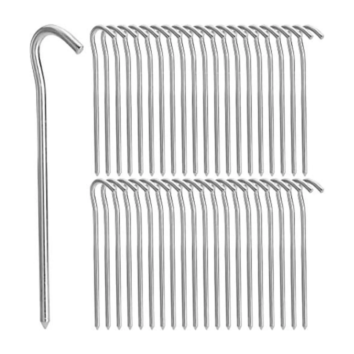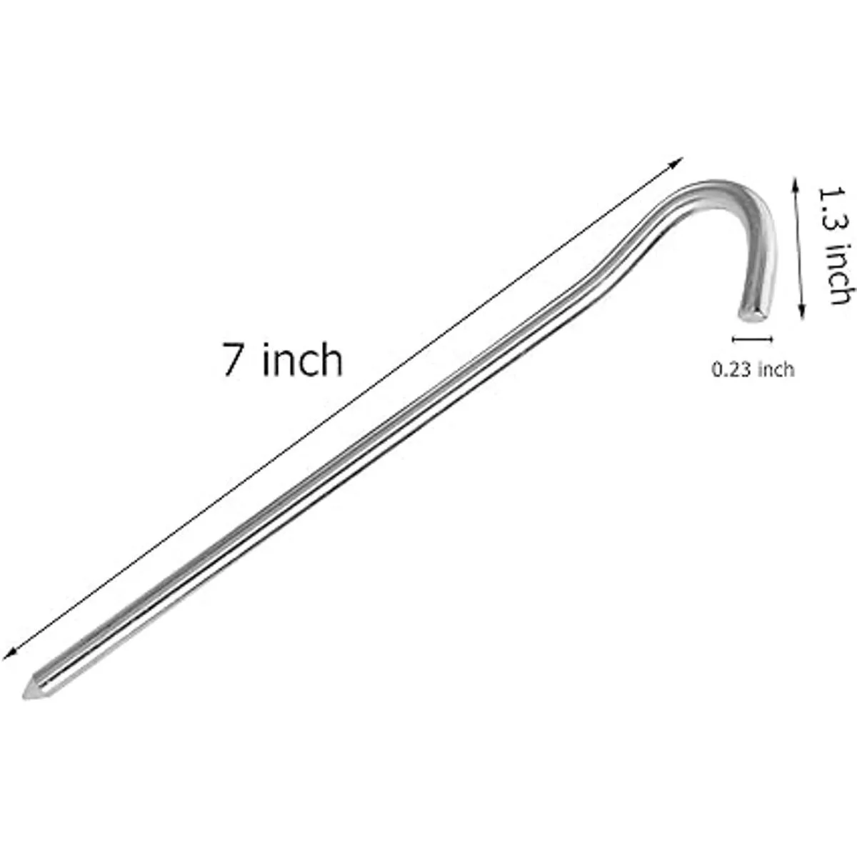 Paquete: incluye 40 clavijas para tienda de campaña, diámetro 0.236 in, longitud 7.1 in, 0.56 oz por unidad. La estaca es una espiga de varilla con un gancho en el extremo superior. Ideal para asegurar decoraciones navideñas al aire libre.