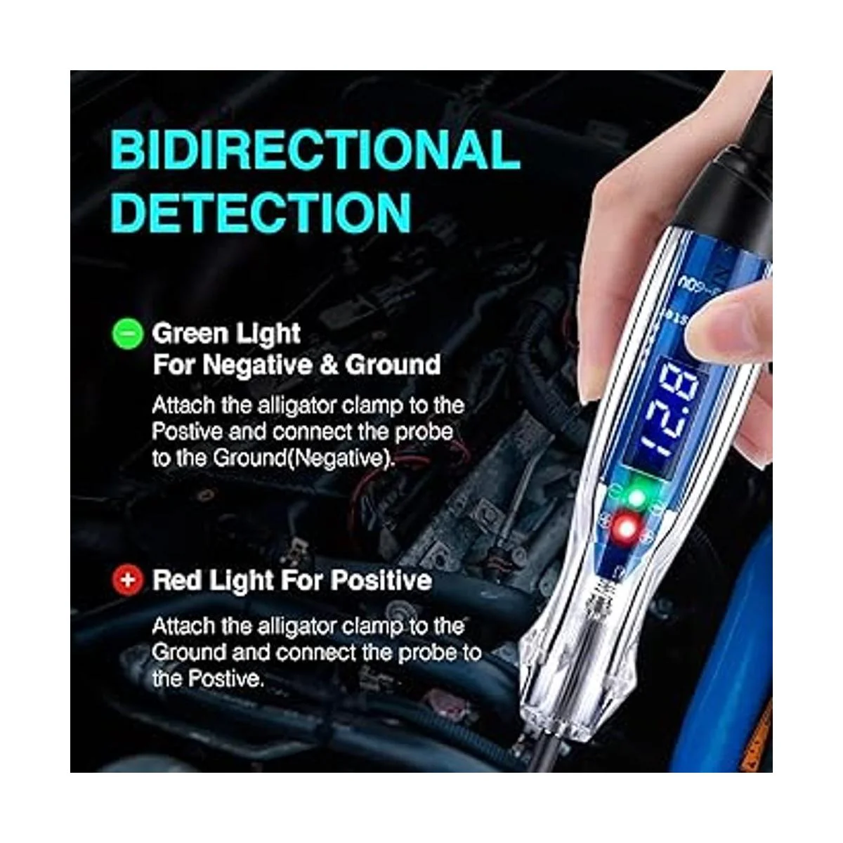 Indicación LED, prueba de voltaje bidireccional: esta luz de prueba de circuito de actualización es un probador de voltaje bidireccional. Puedes fijar la abrazadera de cocodrilo ya sea a tierra negativa o positiva, también hay un diodo emisor de luz en la placa de circuito para indicación de polaridad, la luz roja indica polaridad positiva y la luz verde indica polaridad negativa.