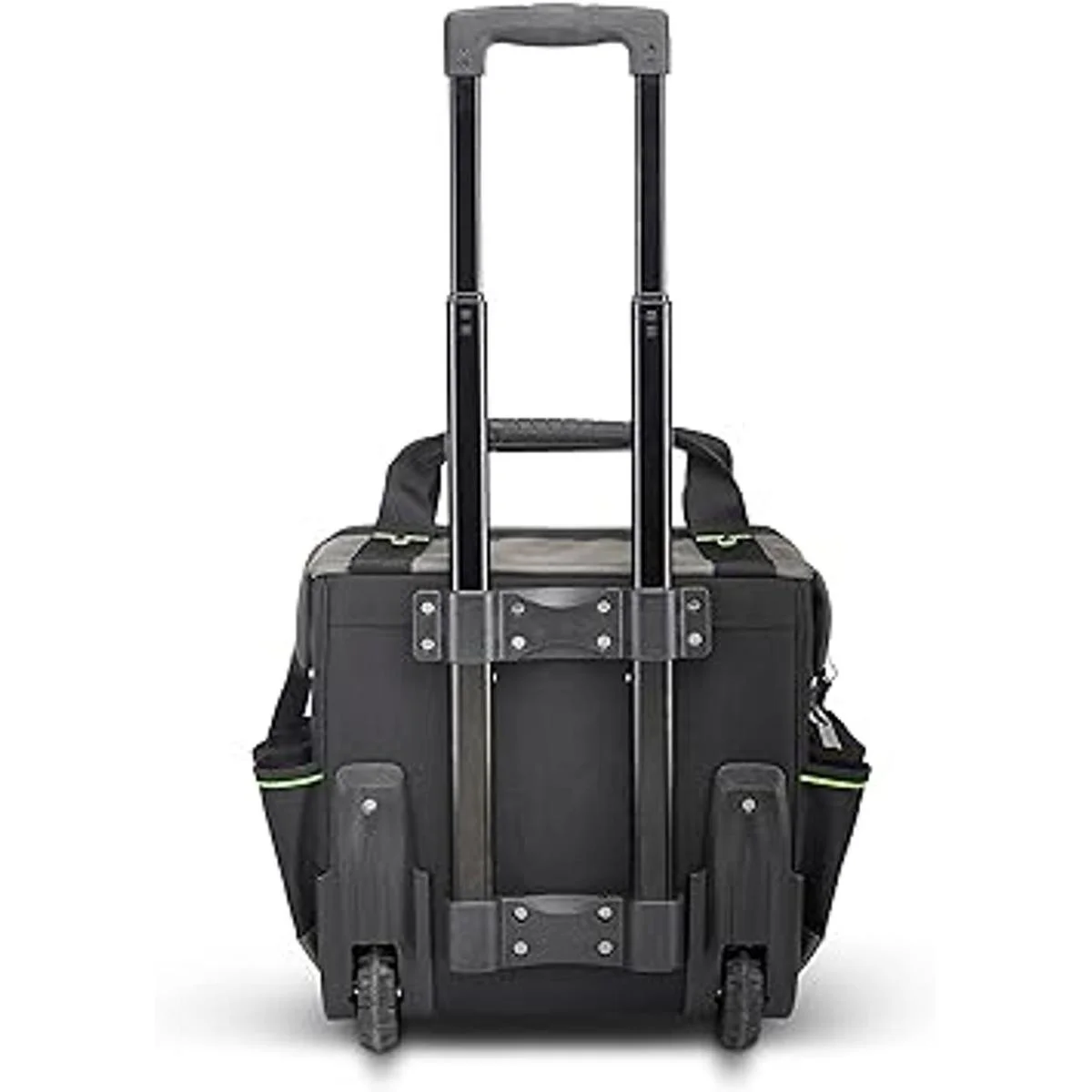Transporte versátil: ruedas resistentes y mango telescópico que se extiende para un fácil transporte. Asas de agarre de goma que permiten un fácil levantamiento y transporte de la bolsa de herramientas a mano