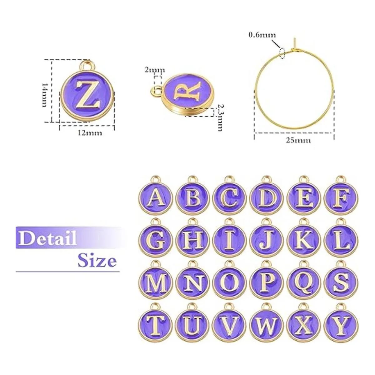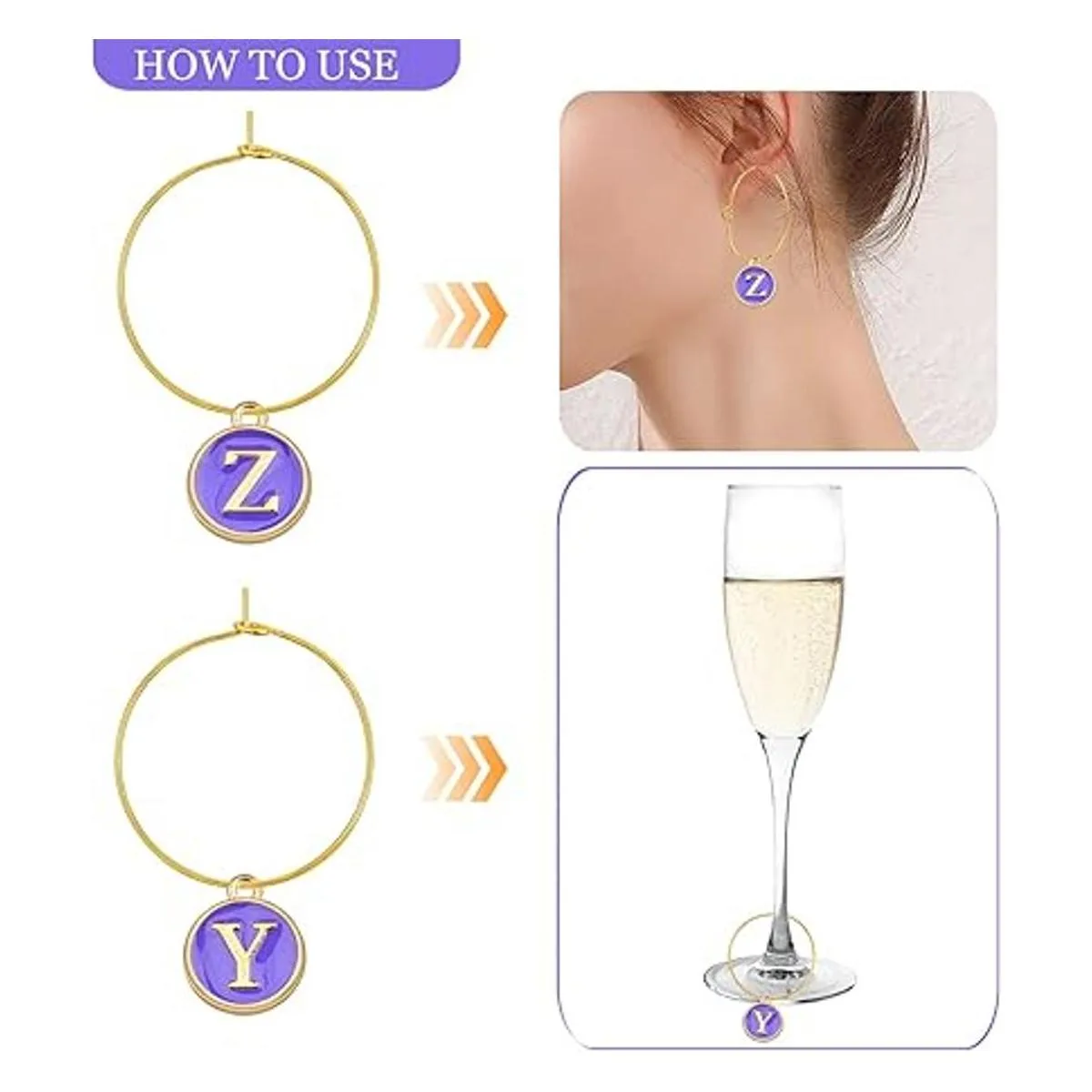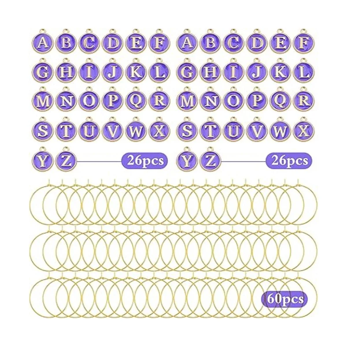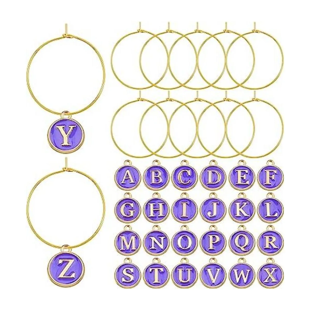 Aylifu 60 anillos dorados de copa de vino de 0.984 in y 2 juegos 52 unidades de dijes de letras iniciales de esmalte morado para copas de tallo, champán, decoración de reuniones