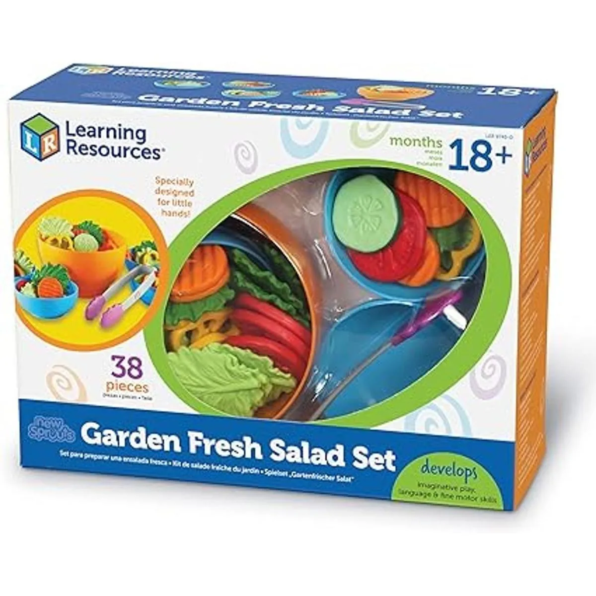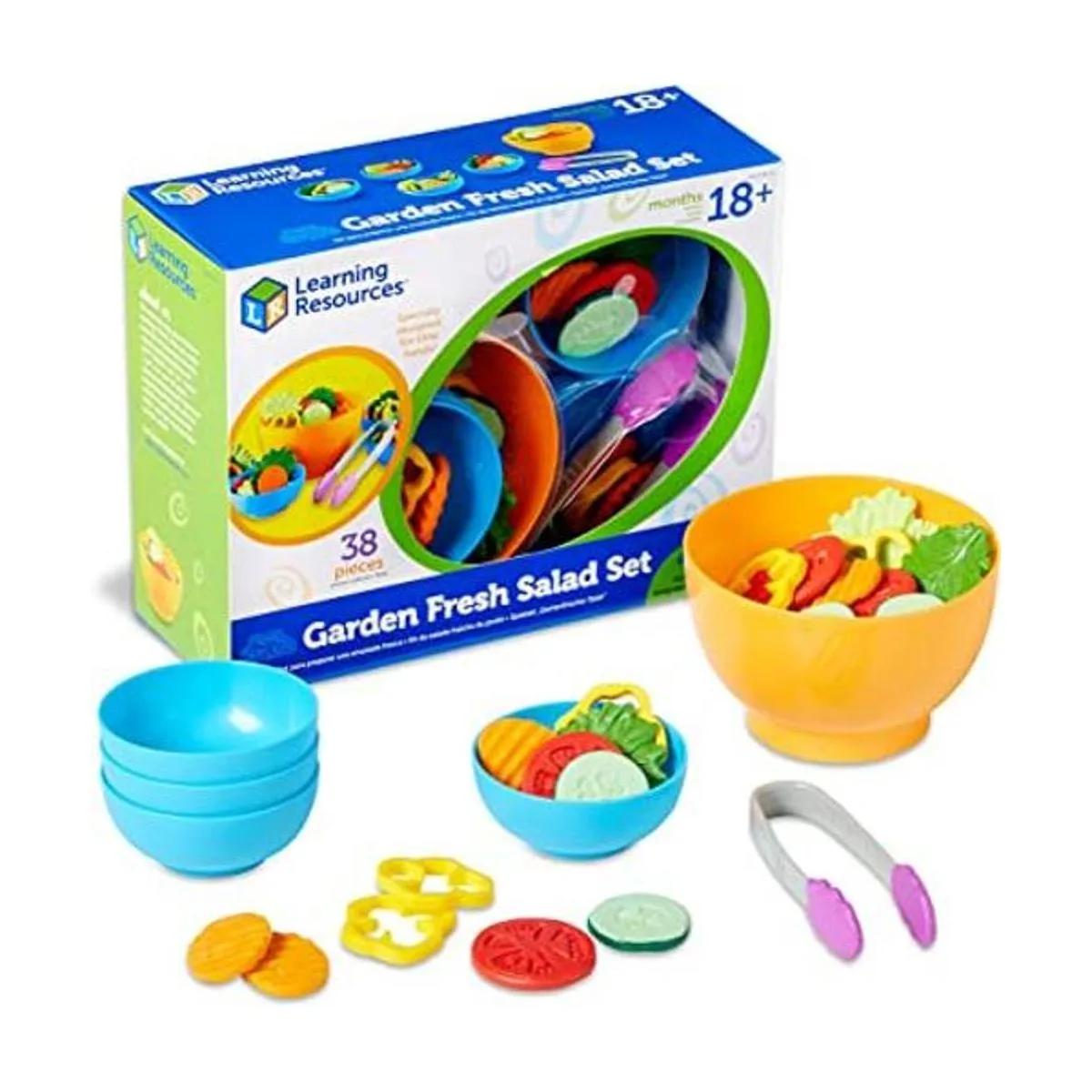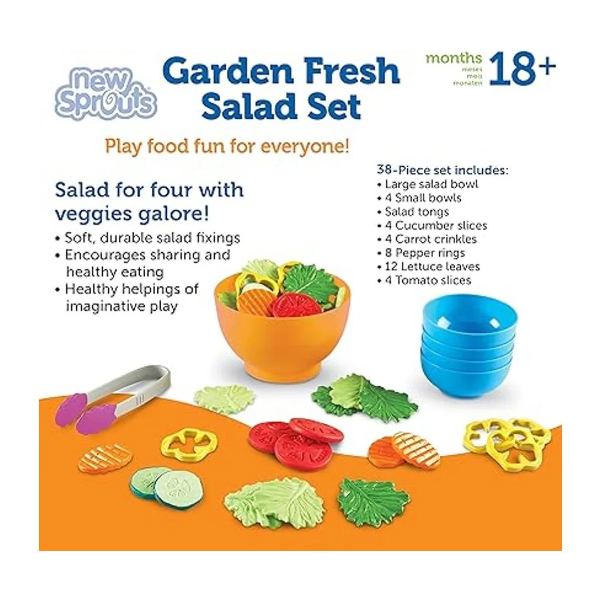 Este juego de 38 piezas ultra fresco incluye: 12 hojas de lechuga, 4 rodajas de tomate, 4 rodajas de pepino, 4 arrugas de zanahoria y 8 anillos de pimienta junto con un cuenco más grande, cuatro cuencos individuales y 1 par de pinzas.
