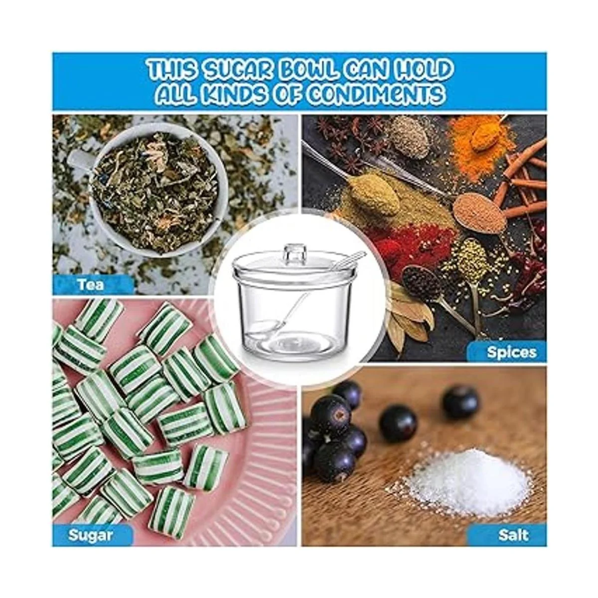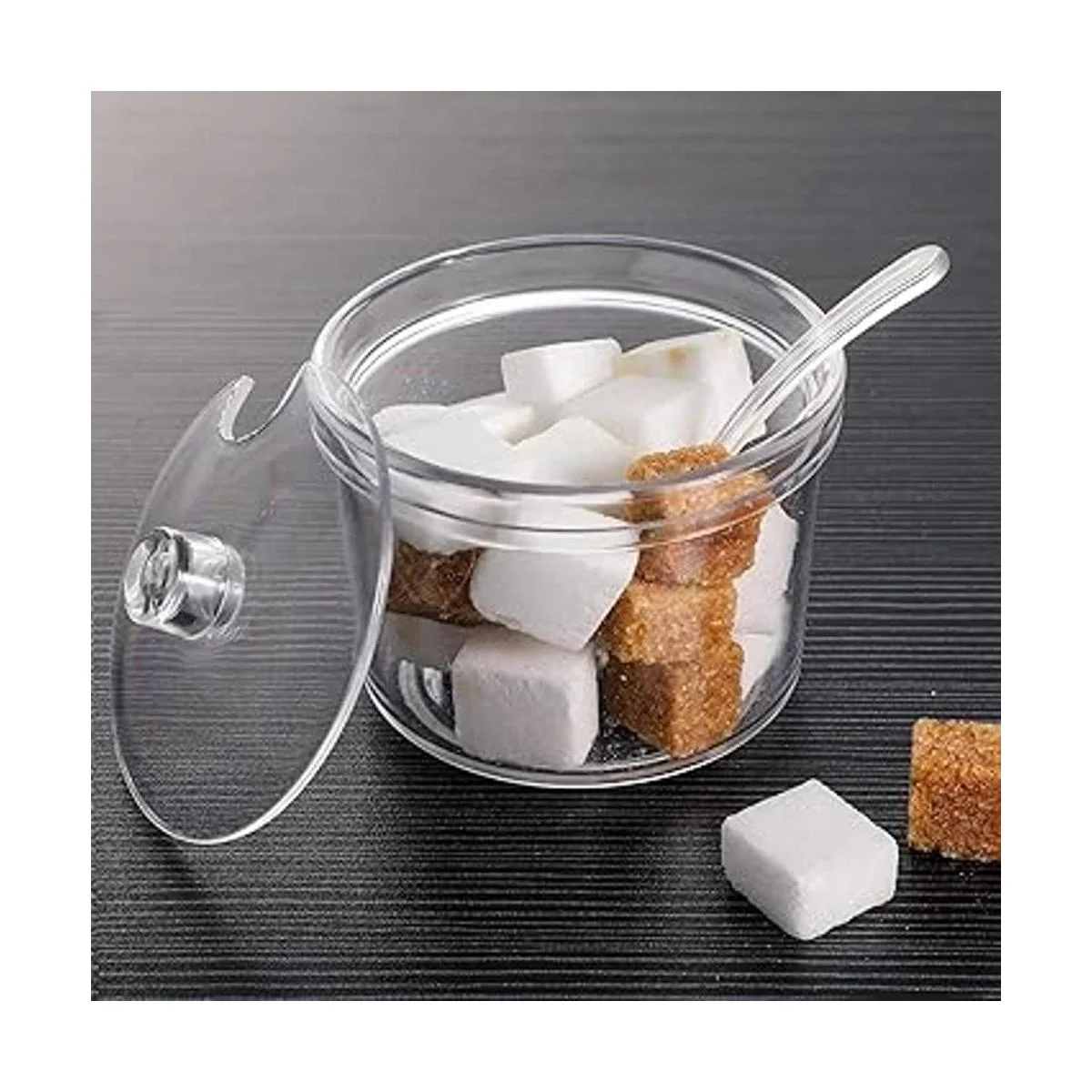 Azucarero de acrílico transparente con tapa, cuchara de sal, tarro de azúcar con tapa para azúcar, sal, té, especias, hierbas, condimentos 7.1 oz