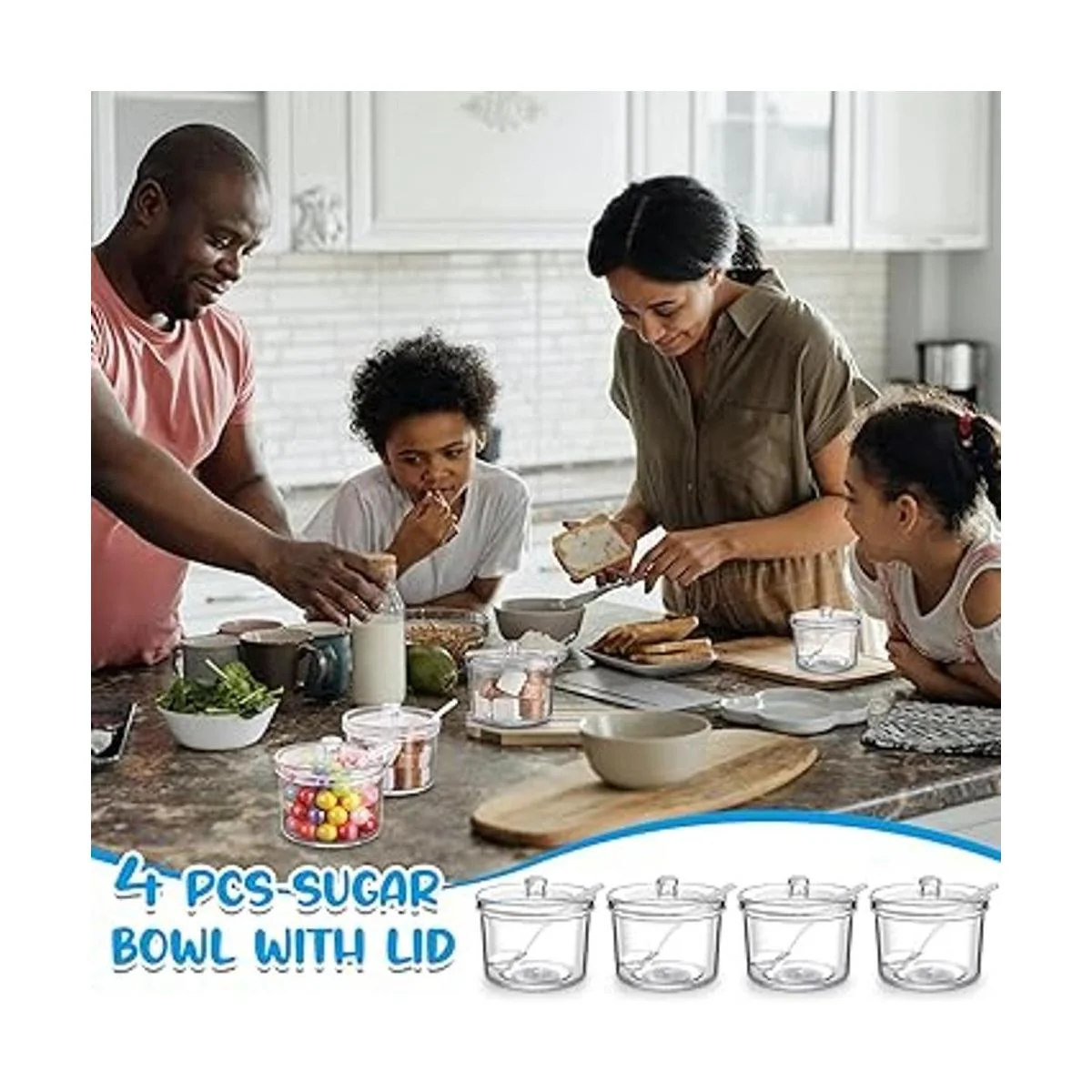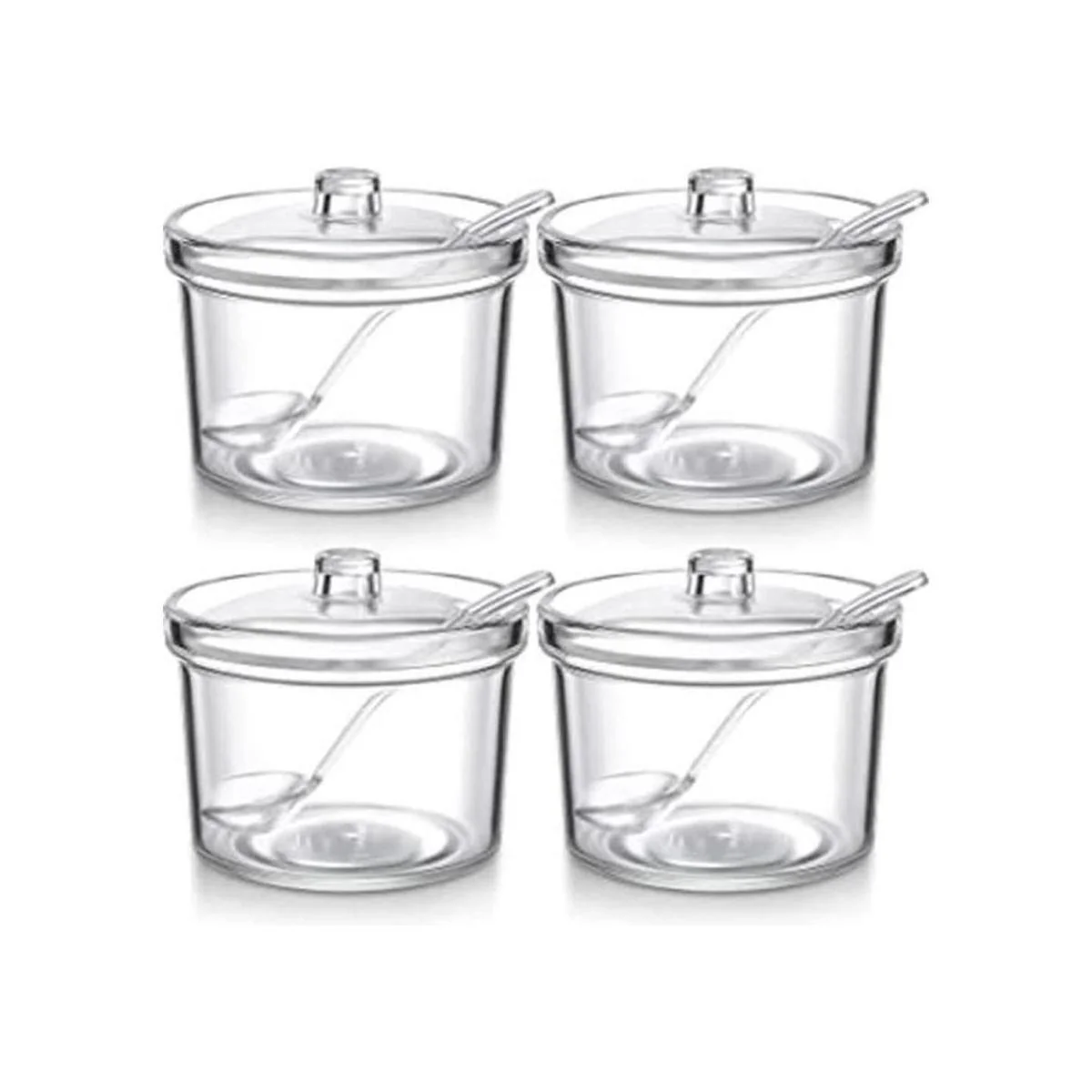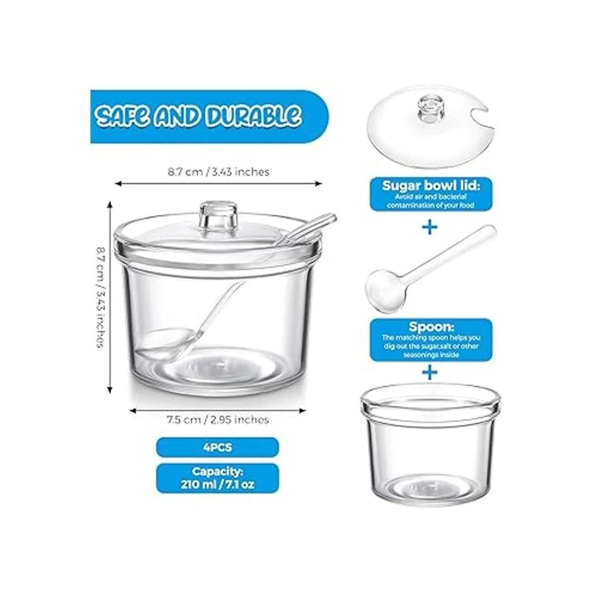 El paquete incluye: recibirás 4 cuencos de azúcar acrílicos transparentes con tapa, cada uno mide aproximadamente 3.4 x 3.4 x 3.0 in, la capacidad es de aproximadamente 7.1 fl oz, es ligera y fácil de transportar