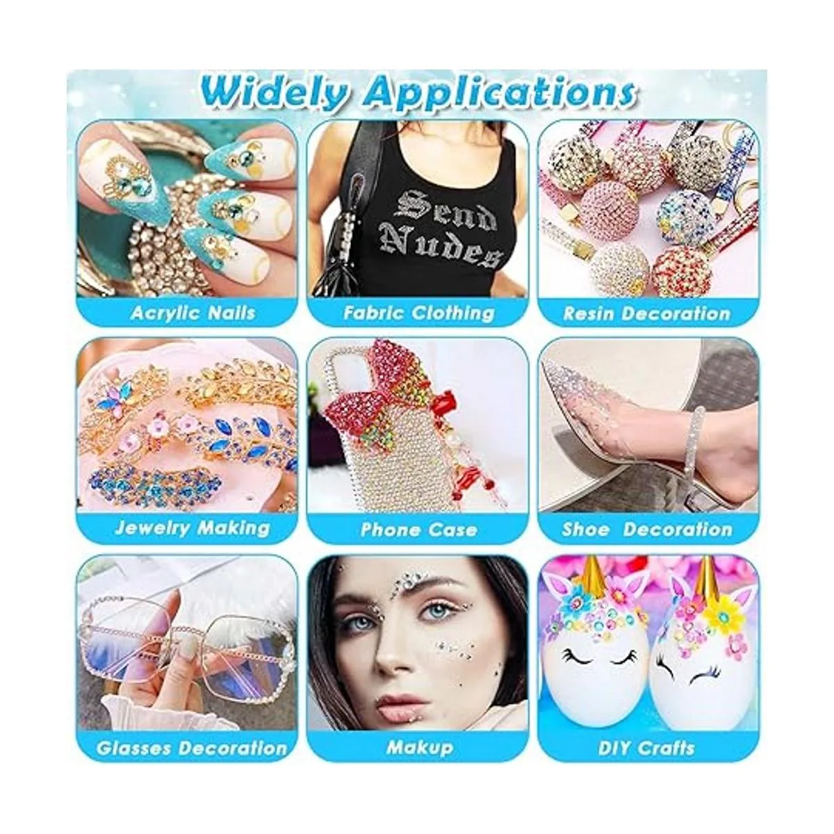 Amplias aplicaciones: el juego de herramientas de diamantes de imitación y pegamento puede adherirse permanentemente a una variedad de materiales, perfecto para hacer joyas, arte de uñas, metal, vidrio, goma, papel, cerámica, madera, cuero, uso doméstico y otros fines de reparación de manualidades