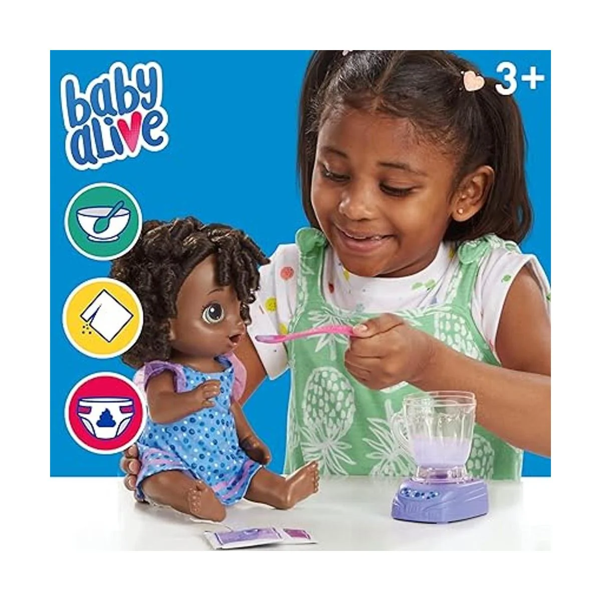 Baby Alive Muñeca mágica mezcladora de arándanos con accesorios para licuadora, bebidas, mojadas, comidas, juguete de cabello negro para niños a partir de 3 años