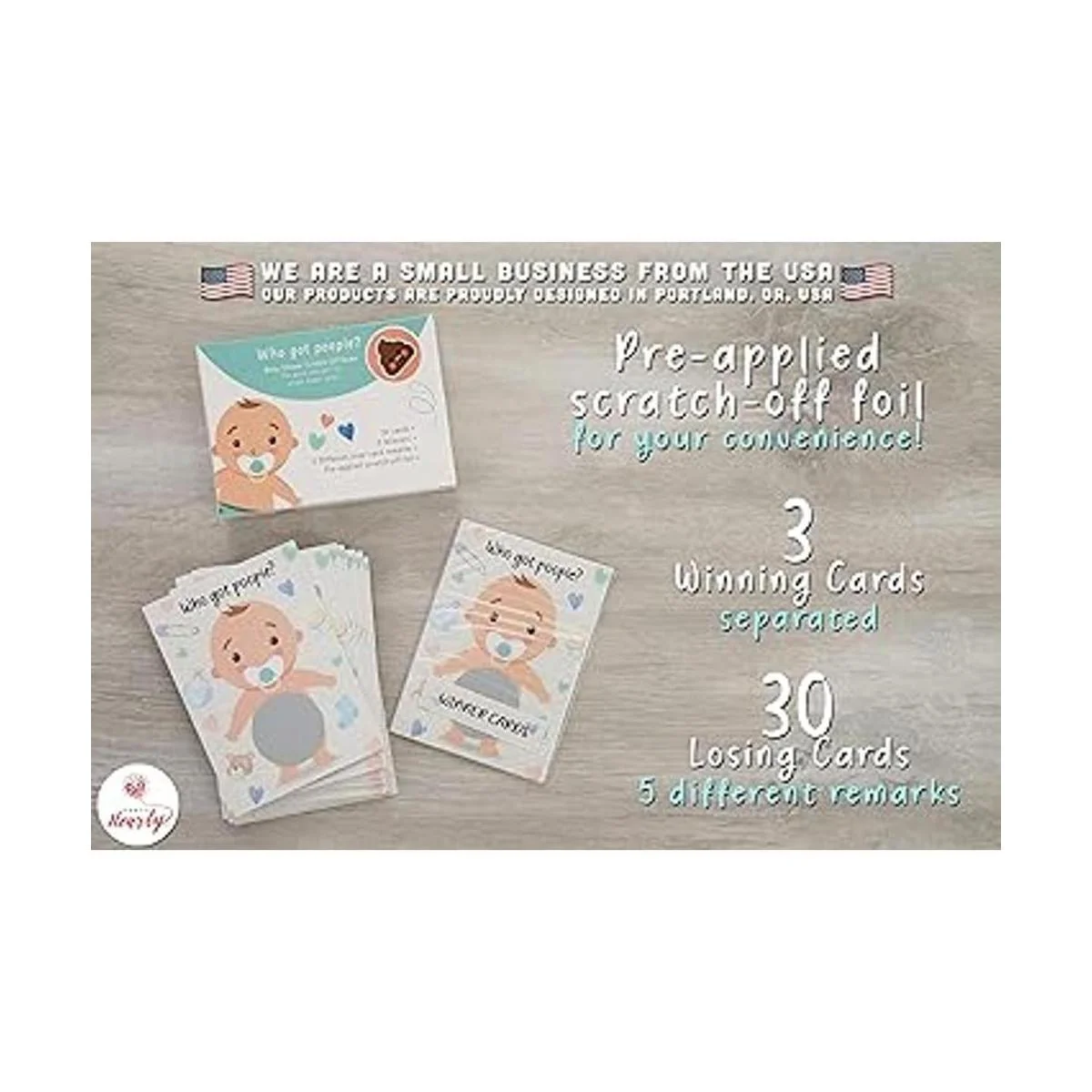 Diseño único, exclusivo, bonito y de género nuevo: impreso profesionalmente en una cartulina gruesa mate de alta calidad, resistente para la raspadita que mide un tamaño perfecto de 2.5 x 3.5 pulgadas. Se adapta a cualquier tema de baby shower que puedas tener.