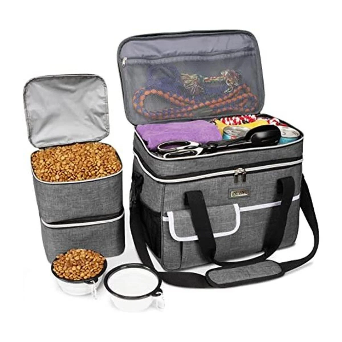 BAGLHER Bolsa de viaje de doble capa para mascotas, bolsa de almacenamiento multifuncional para perros y gatos, con 2 recipientes de comida para mascotas y 2 cuencos plegables de silicona, kit esencial de gran capacidad para viajes de mascotas.