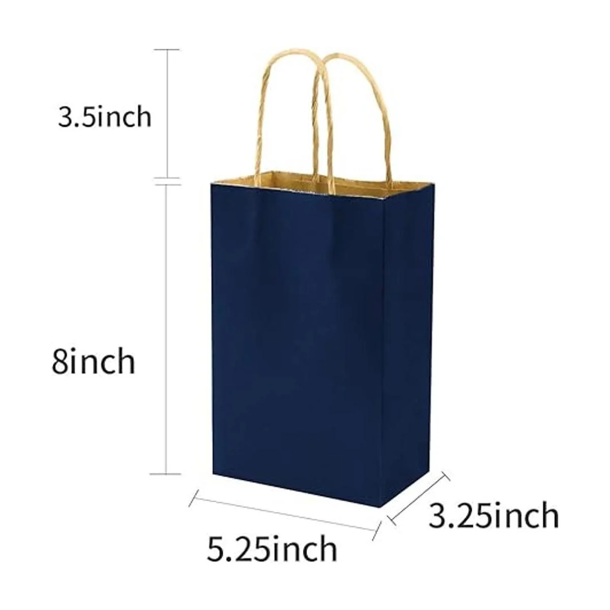 Tamaño de la bolsa de regalo de papel: longitud 5.25 pulgadas, ancho 3.25 pulgadas, alto 8 pulgadas, papel kraft de peso base de 3.88 oz/m con asas.