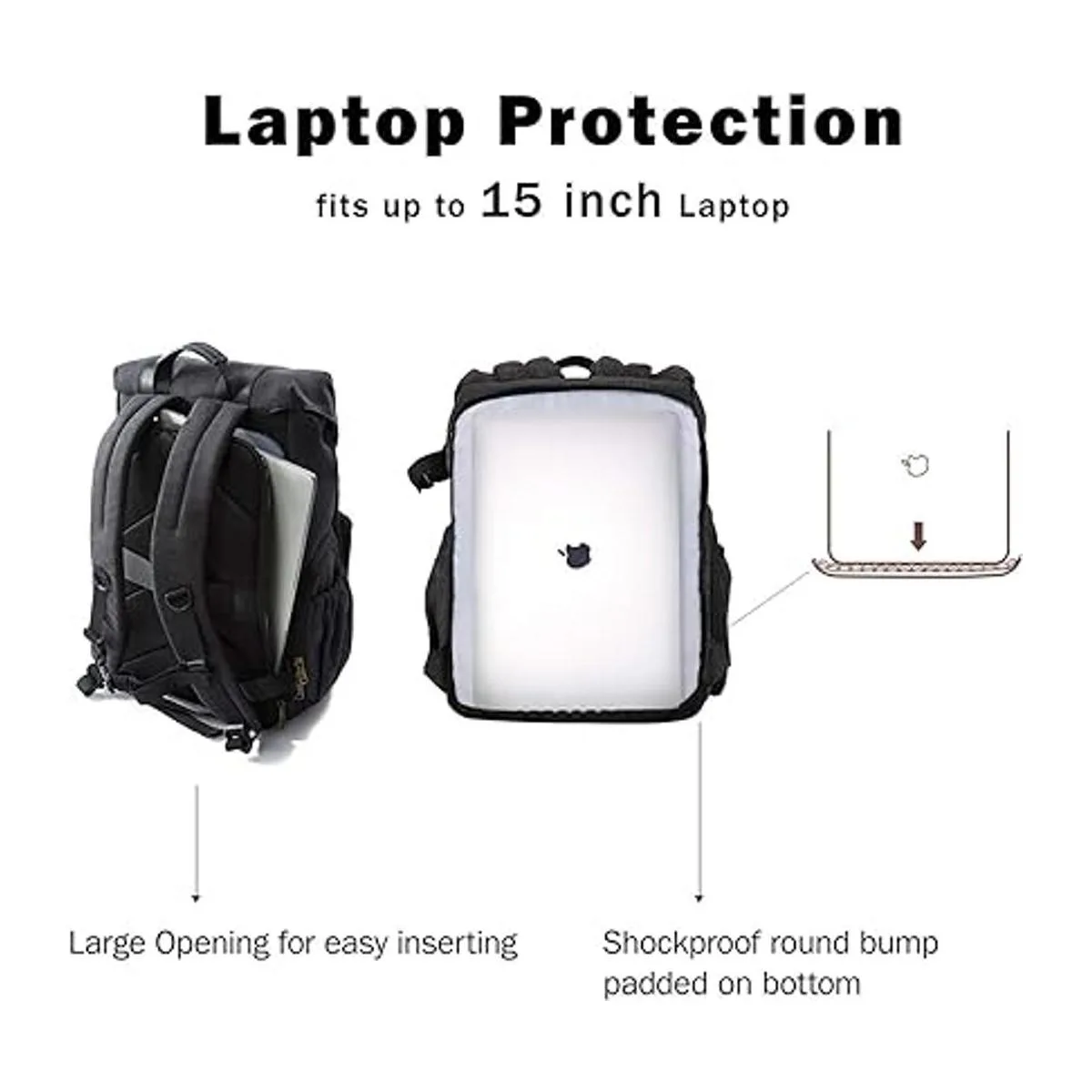 Mochila de cámara de gran capacidad: 11.5 pulgadas de largo x 7 pulgadas de ancho x 17.3 pulgadas de alto. El espacio de almacenamiento superior para guardar ropa u otras cosas personales. La zona inferior de la cámara para 1 cámara DSLR con lente de 2.7567.874 in adjunta, 35 lentes estándar y otros accesorios de cámara. 1 compartimento separado grueso acolchado para laptop de hasta 15 pulgadas con parte inferior acolchada que absorbe los golpes.