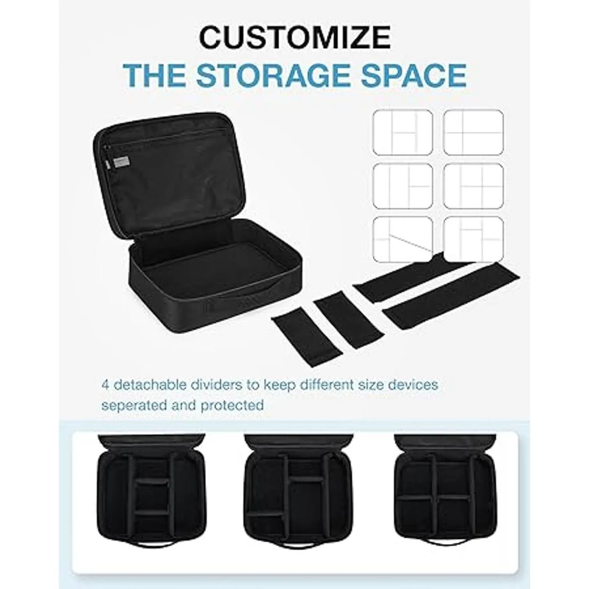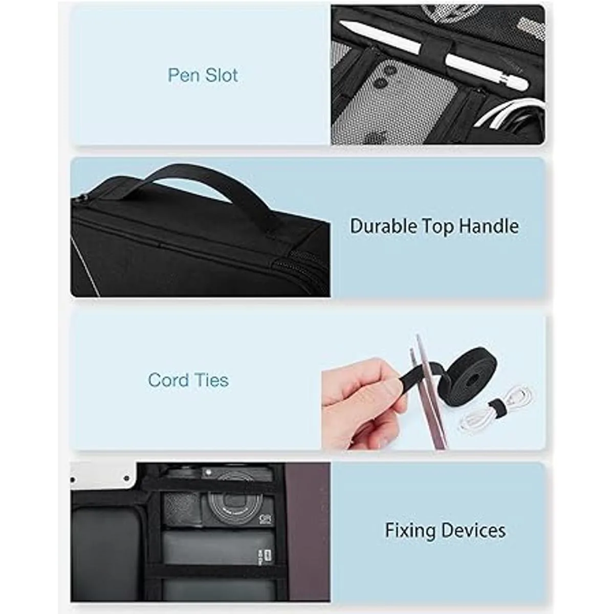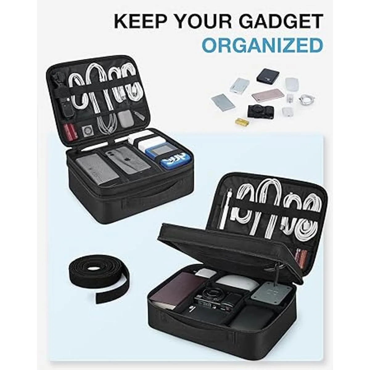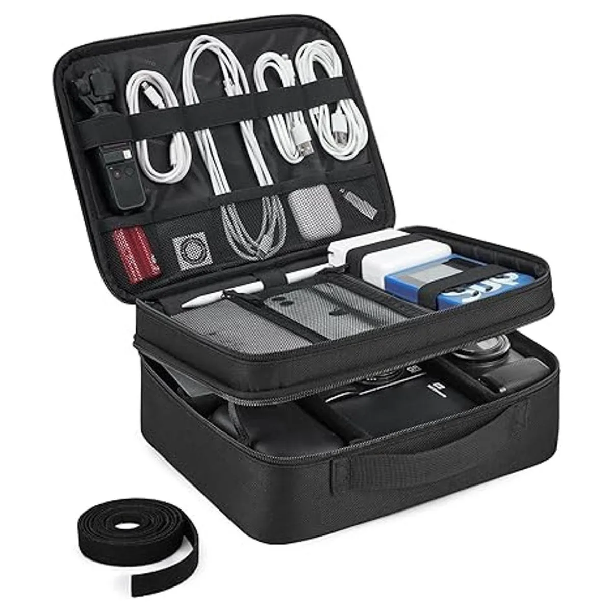 Espacioso: 2 capas dobles. La primera capa para organizar objetos pequeños como cables, USB, cargadores. La segunda capa para almacenar los más grandes, como cables más voluminosos, fuentes de alimentación, adaptadores, discos duros externos, tableta de 10.5 pulgadas o Kindle y otros accesorios de viaje