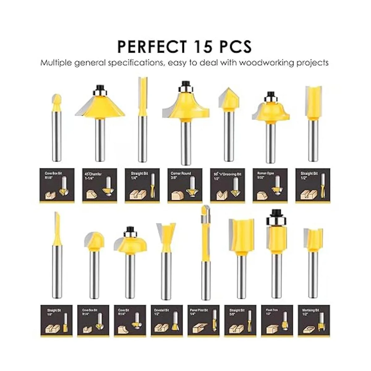 Especificaciones completas: el juego incluye 15 brocas de vástago de 1/4 pulgadas, tamaños más comúnmente utilizados: incluye esquina redonda de 3/8 pulgadas, broca de cola de milano de 1/2 pulgadas, broca de chaflán de 45 11/4 pulgadas, broca piloto de panel de 1/4 pulgadas, broca de cala R1/4 pulgadas, borde empotrado de 1/2 pulgadas, broca romano de 5/32 pulgadas, broca recta de 1/8 pulgadas, broca de 1/8 pulgadas, broca recta ve box bit R1 /8, broca de caja de cala R1/4, broca de ranura V de 90 1/2, broca recta 1/4, broca recta 1/2, broca de mortaja 1/2, broca recta 5/8. Diferentes tipos de cortador, ejercita un efecto diferente.