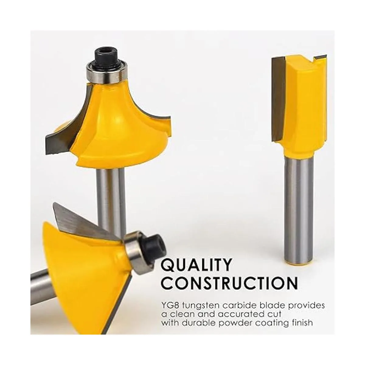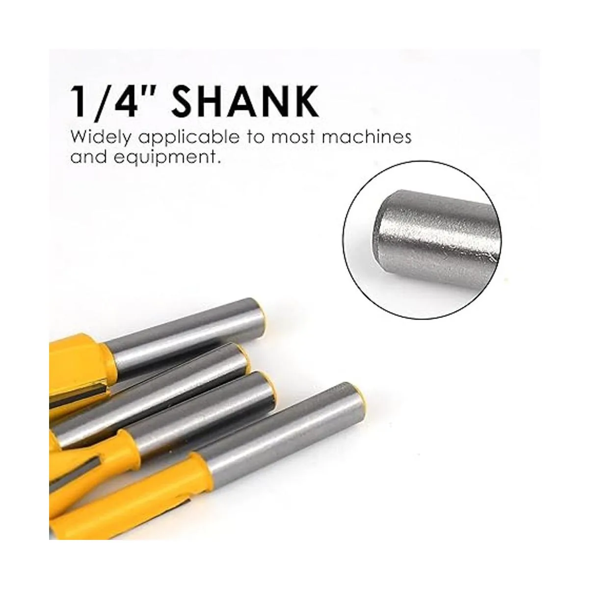 Fuerte versatilidad: todas las brocas de router tienen un vástago universal de 1/4 pulgadas, adecuado para todos los modelos de routers, fresadoras, maquinaria de carpintería, espiga y varias tallas de madera. Las puntas de 1/4 pulgadas proporcionan una mayor estabilidad y menos vibración durante el uso.