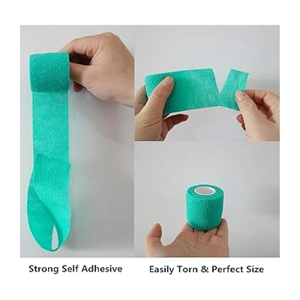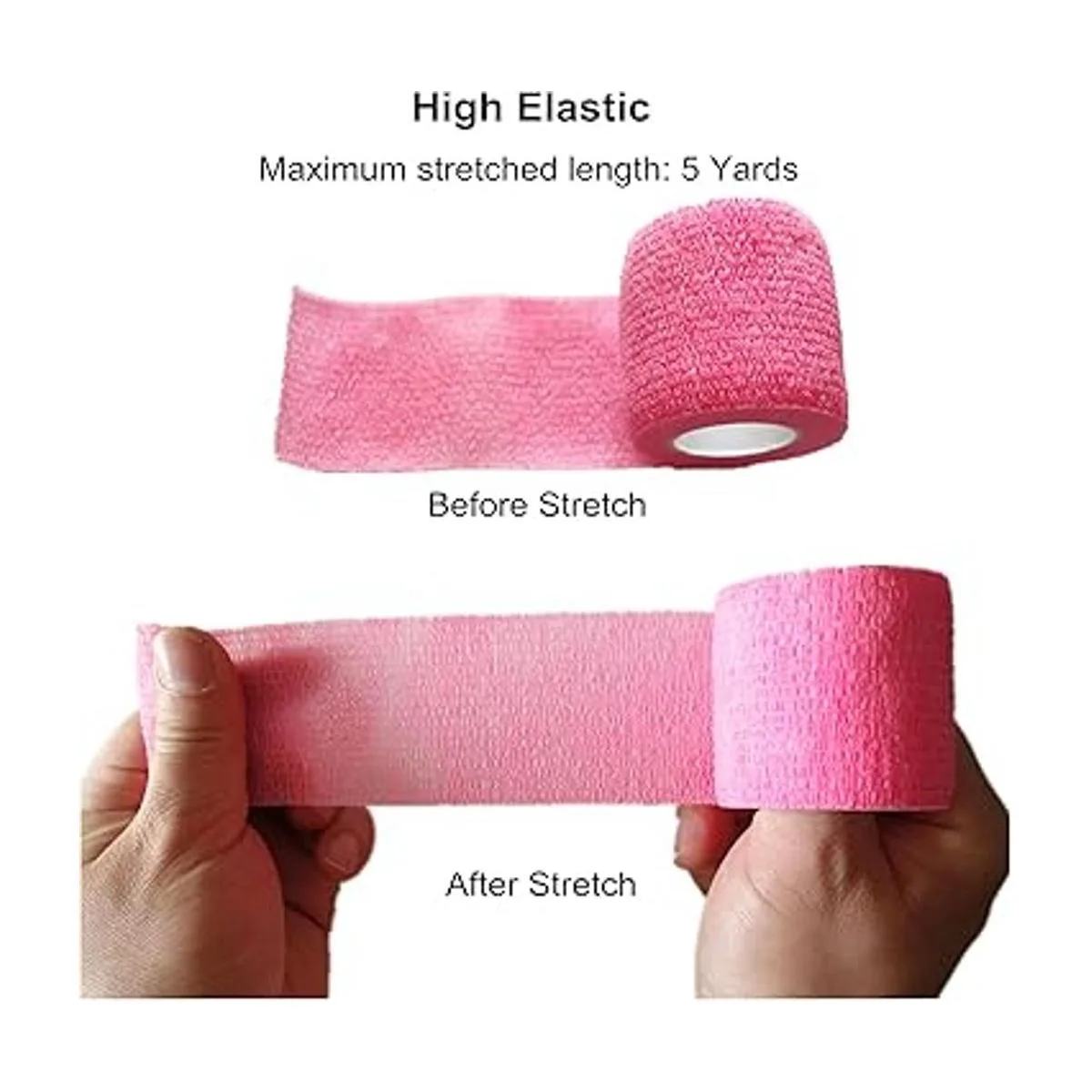 Fácil de aplicar: la envoltura autoadhesiva se puede rasgar fácilmente a mano a cualquier longitud, fácil de envolver y quitar. No solo se utilizan para envolver dedos, muñecas, codos, tobillos, rodillas, sino también otras aplicaciones como envoltura veterinaria para perros, envoltura de agarre de tatuaje, etc.