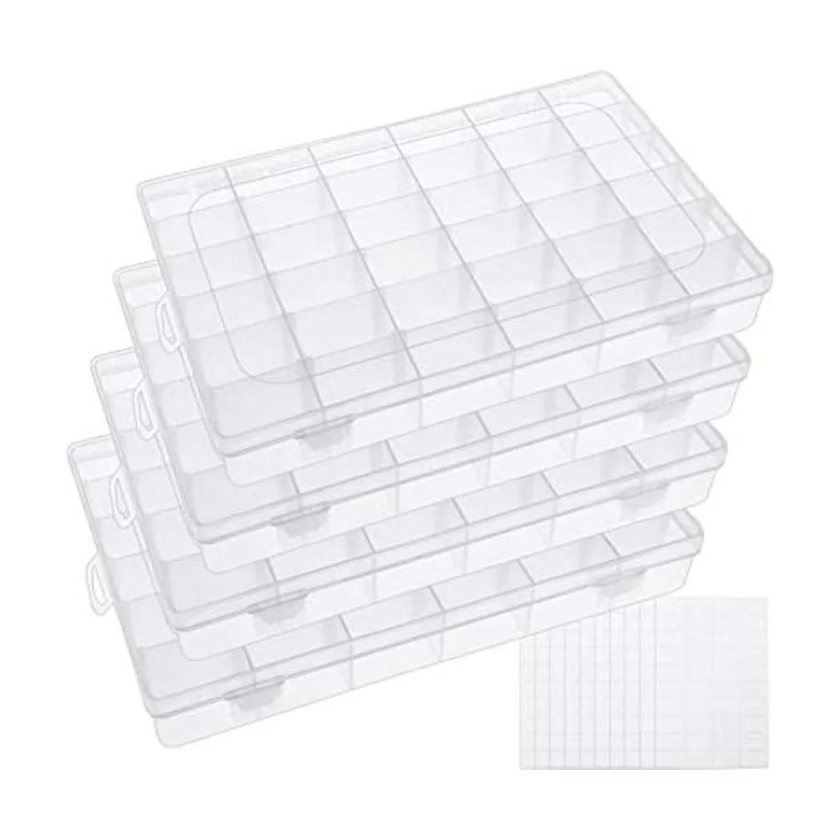 BAKHUK Paquete de 4 cajas organizadoras de plástico transparente de 36 rejillas con divisor ajustable, rejilla extraíble con 400 calcomanías de etiquetas para Washi, cinta, joyería, arte, manualidades, recipiente de cuentas