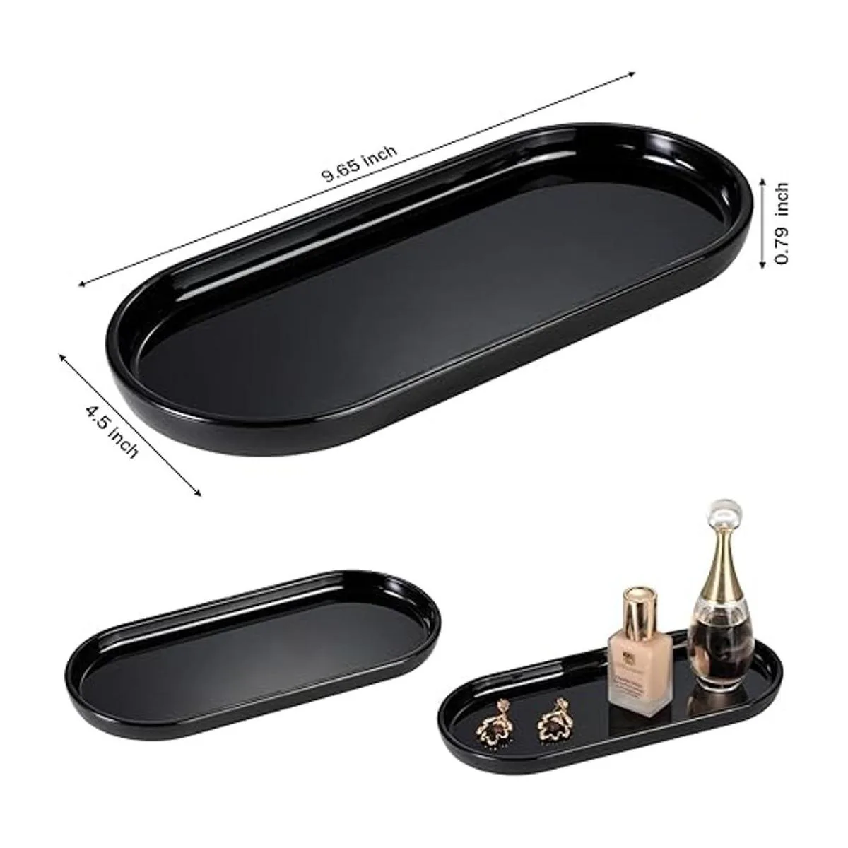 Bandejas organizadoras decorativas de tocador: juego de dos. La bandeja sirve como accesorio perfecto para la habitación. Almacena y muestra artículos como maquillaje, cosméticos, pinceles, cuidado de la piel, perfume, aerosoles corporales, botellas de loción, dispensador de jabón, soporte para qtip, viales y más en encimeras de baño y tocador. Color: negro